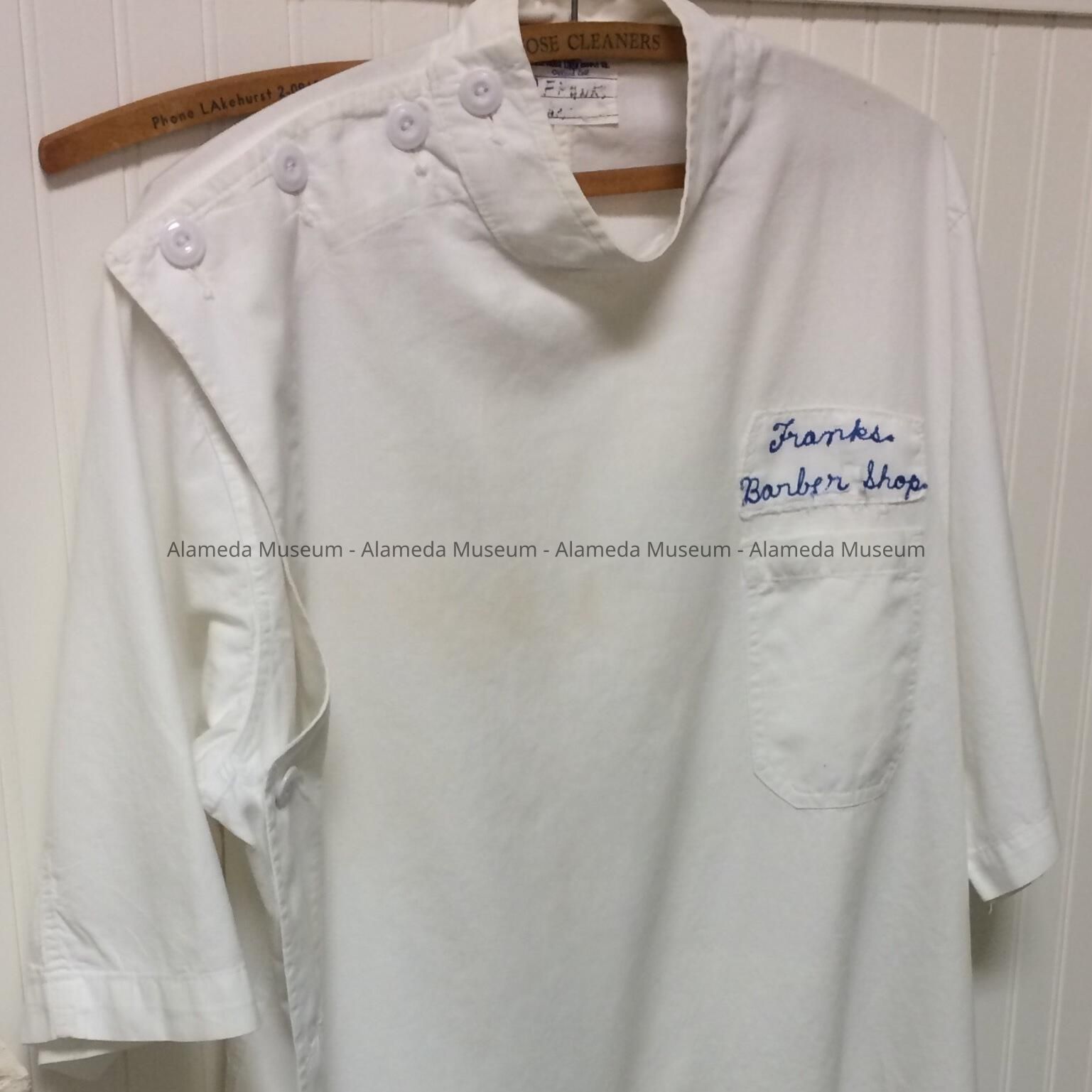 BARBER'S SMOCK USED AT FRANK'S BARBER SHOP, 2055 LINCOLN AVENUE, ALAMEDA, CALIFORNIA. FRANK WAS THE LATE UNCLE OF FORMER ALAMEDA MAYOR, CHUCK CORICA.