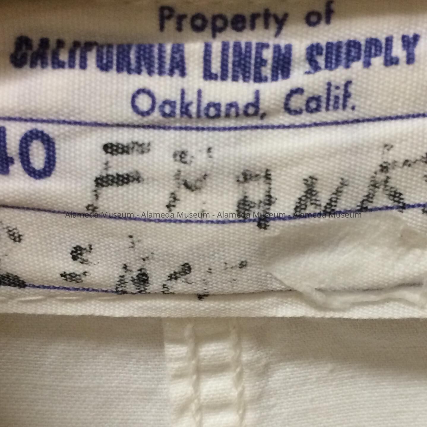 WHITE LINEN SMOCK, WITH EMBROIDERED MESSAGE ABOVE LEFT POCKET IN BLUE-COLORED THREAD, "FRANK'S BARBER SHOP." LABEL IS SEWN TO THE NECK, AND READS "PROPERTY OF CALIFORNIA LINEN SUPPLY COMPANY, OAKLAND, CALIFORNIA."