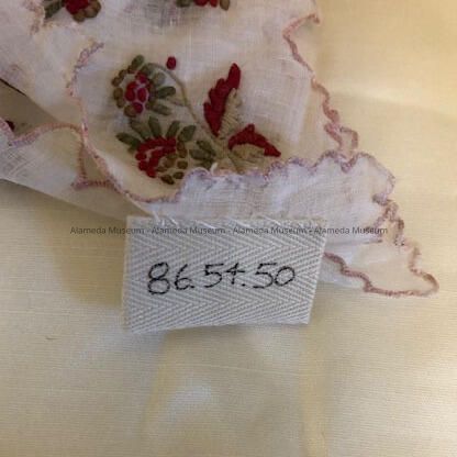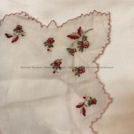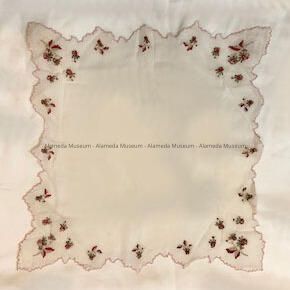 Description: White linen handkerchief with hand embroidered flowers (red & yellow) & leaves (green). Scalloped border of pink colored embroidery.