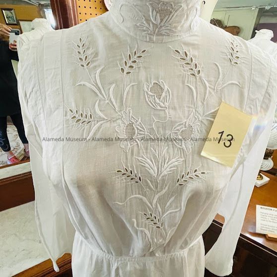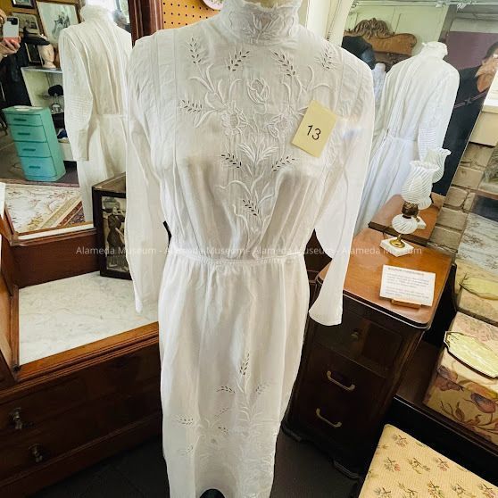 History of Object: Dress worn by Bertha, wife of Henry H. Meyers, noted county architect. The late Mr. & Mrs. Meyers were longtime residents of Alameda, establishing their home here in 1894.