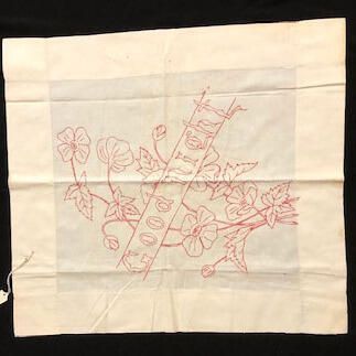 WHITE LINEN PILLOW SHAM, WITH DECORATIVE DESIGN OF FLOWERS AND LEAVES, AND A BANNER WHICH STATES "GOODNIGHT" --- ALL IN RED-COLORED THREAD.