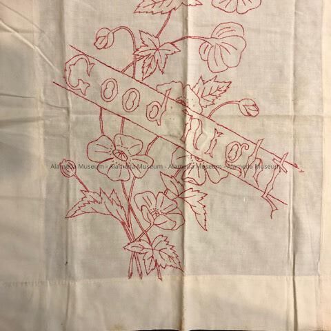 White linen pillow sham with a banner stating 'Goodnight', c. 1900Entry/Object ID