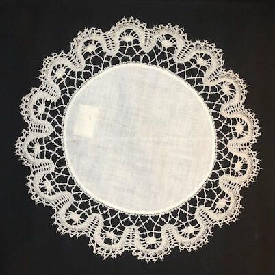 Table doily of circular shaped white colored linen with crocheted lace edge.
