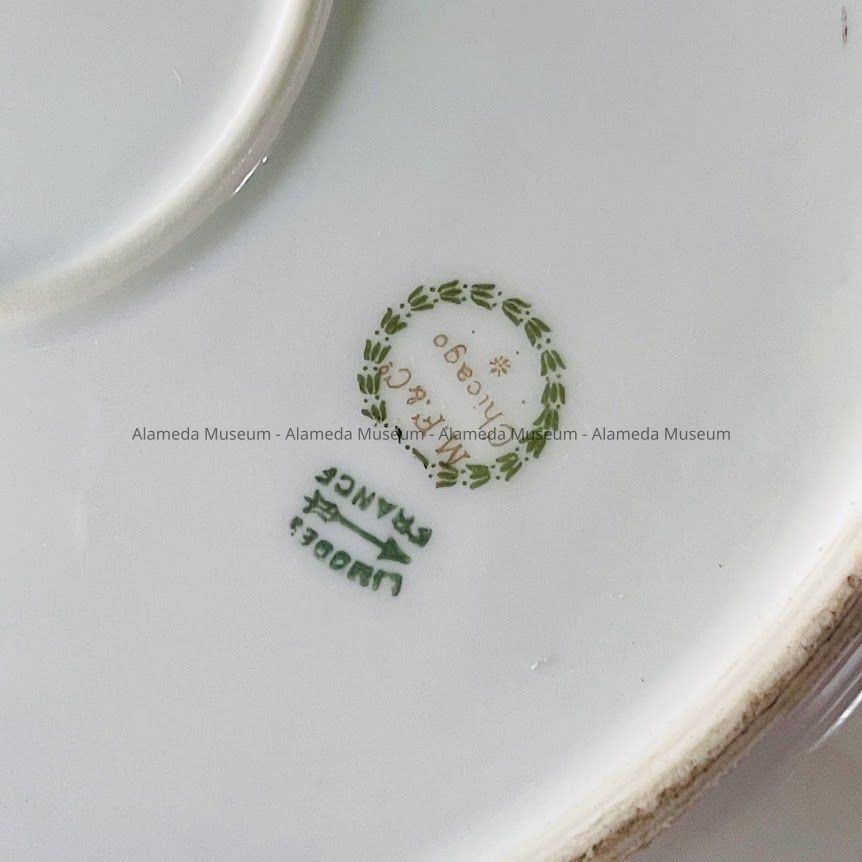 COLD-CUT SIZE PLATE OF WHITE-COLORED PORCELAIN, WITH TRANSFER DESIGN OF PINK- AND LAVENDER-COLORED FLOWERS WITH GREEN LEAVES. PORCELAIN SIGNED ON REVERSE SIDE, "LIMOGES, FRANCE. ME AND COMPANY, CHICAGO, ILLINOIS."