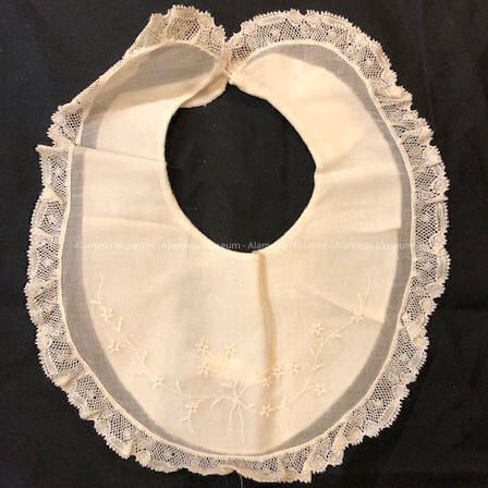 Description: White organdy baby bib trimmed with machine lace & embroidery.