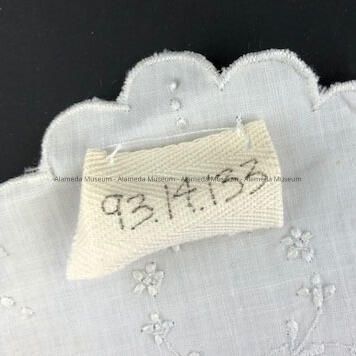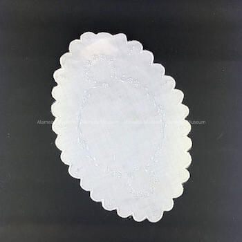 White oval linen doily with pale blue embroidered flowers, c. 1920sEntry/Object ID