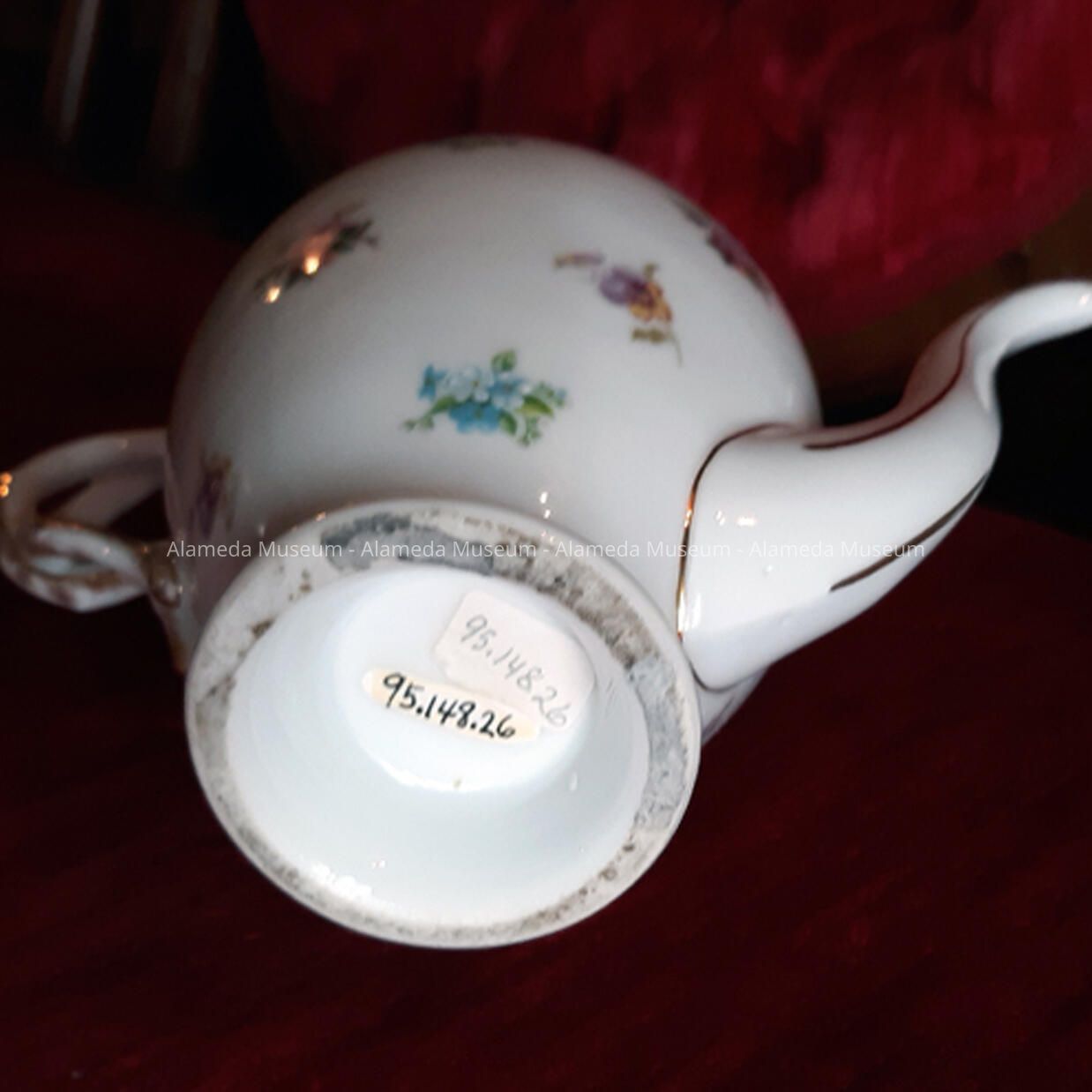 White pedestal-base teapot with design of flowers and rope handle, c. early 1900sEntry/Object ID