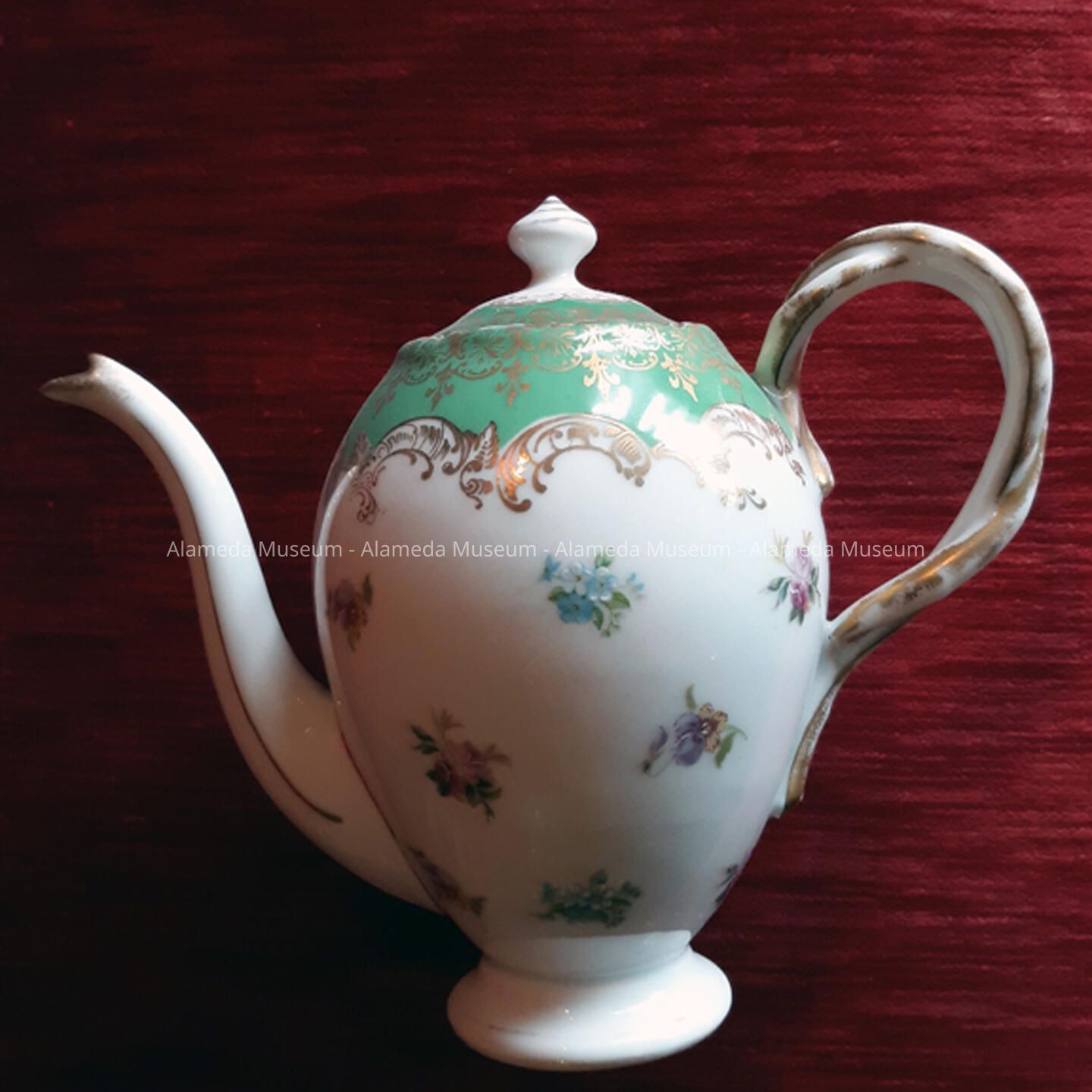 PEDESTAL-BASE TEAPOT OF WHITE-COLORED PORCELAIN, DECORATED WITH TRANSFER DESIGNS OF ROSES, PANSIES, AND VIOLETS. THE UPPER PART OF THE TEAPOT AND LID APPEAR TO HAVE A HAND-PAINTED GREEN RINSE, WITH TRANSFER DESIGN IN GOLD. AN ORNATE INTER-TWINED ROPE HANDLE. SPOUT AND LID ARE TRIMMED IN GOLD. THE PORCELAIN TEAPOT IS UNMARKED, BUT APPEARS TO BE OF GERMAN OR FRENCH ORIGIN.
