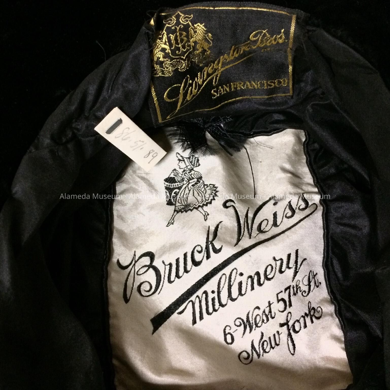 Description: Wide brim black Velvet hat with band decorated with grouping of black silk faille rosettes & jet with rhinestone trimming. Brim of hat trimmed in black lace. Interior label states "Bruck Weiss, New York." Purchased at Livingstons Brothers, S.F.