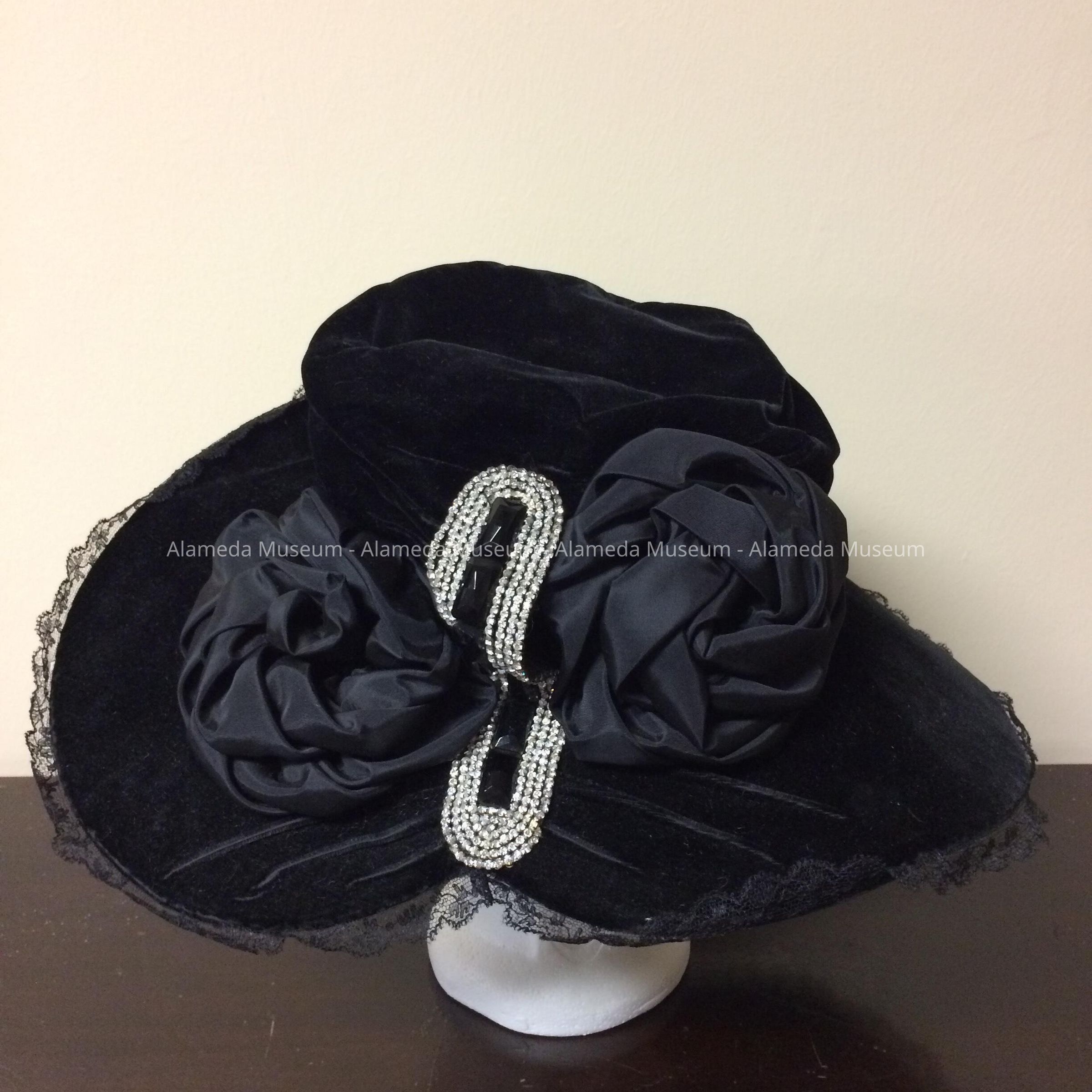 Wide brim velvet hat with black rosettes and rhinestones and lace, 1920sEntry/Object ID