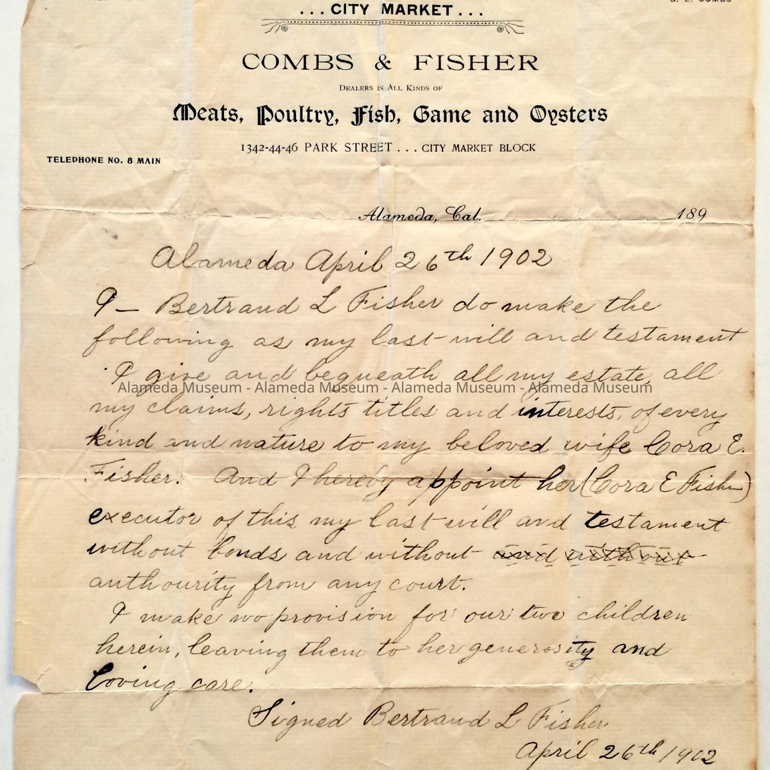 History of Object: Will of Bertrand L. Fisher, of the Combs & Fisher City Market, Park Street, Alameda, Calif. Dated April 26, 1902.
