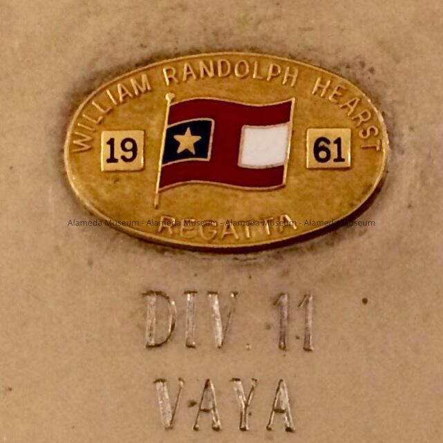 Description; A silver plate with an upraised rim that has an ornamental design. Upon the plate's surface is affixed a small gold medallion inscribed: "William Randolph Hearst Regatta" and the year 1961, plus a red/white/blue yachting flag. Below this, etched into the plate, is: "Div II, Vaya 3rd".