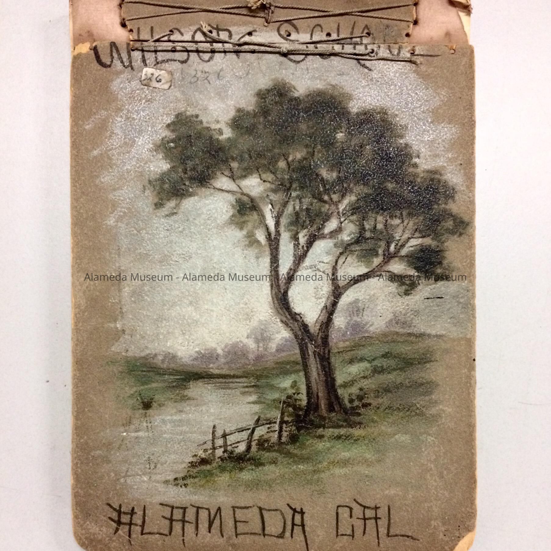 Loose leaf composition book. Hard cover has a hand painted scene of a tree with bold printed caption "Wilson School, Alameda, Cal.". Pale blue silk cording acts as a binding.
