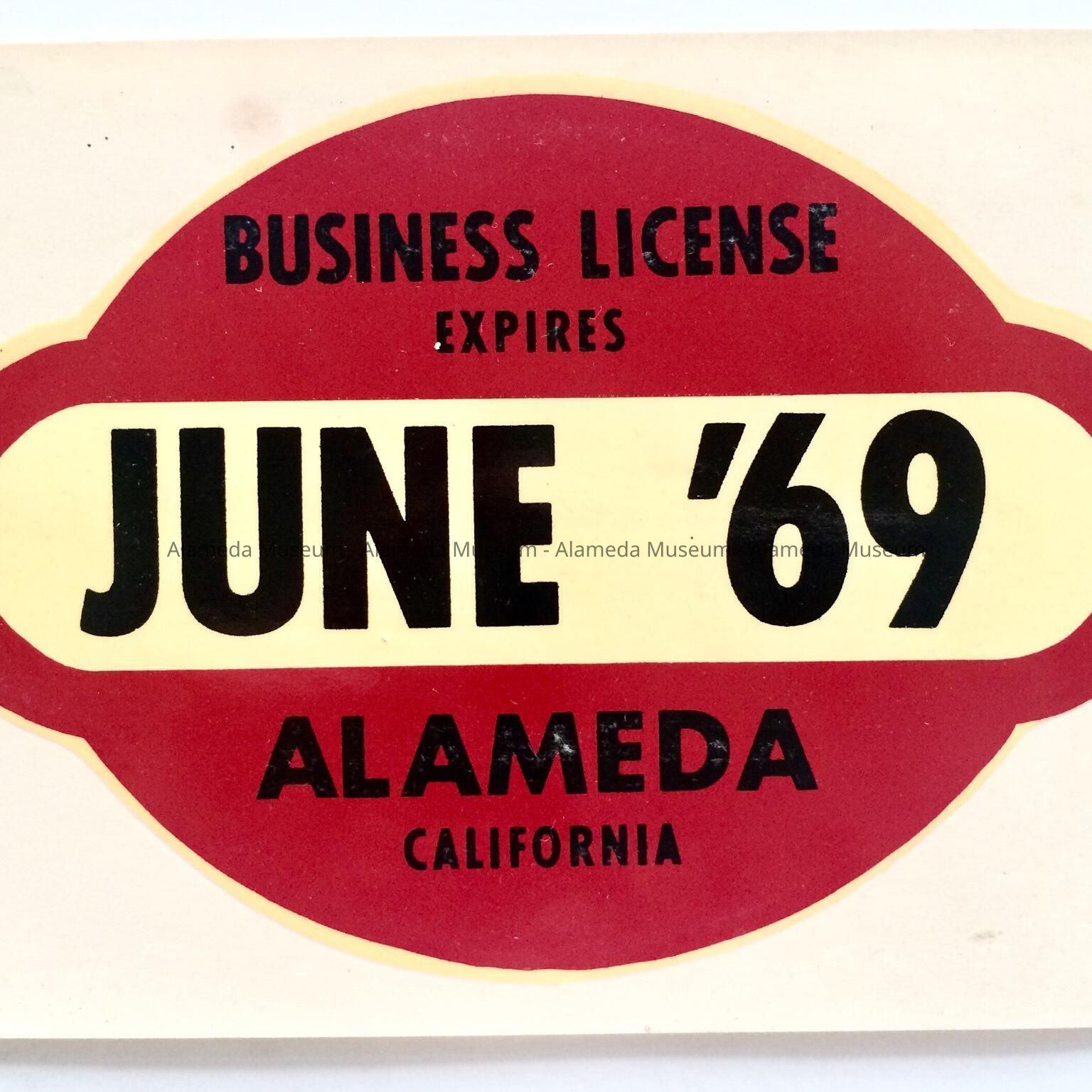 HISTORY OF OBJECT: A WINDOW DECAL ISSUED BY THE CITY OF ALAMEDA FOR A BUSINESS LICENSE. DECAL HAD AN EXPIRATION DATE OF JUNE 1969.