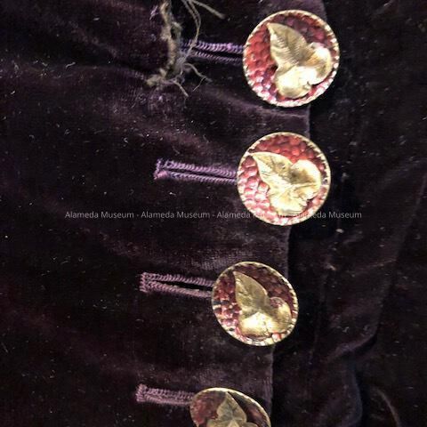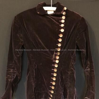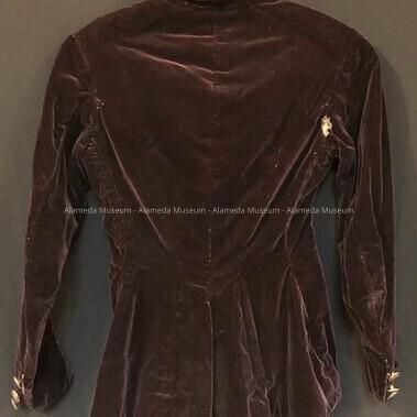 History of Object: Wine colored velvet jacket which was worn by Miss. Bertha May, later to be the wife of Henry H. Meyers, noted resident Alameda architect.