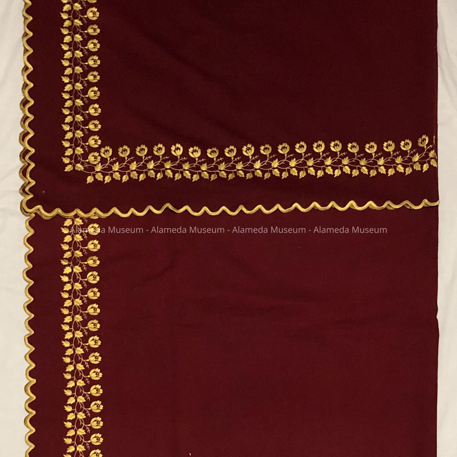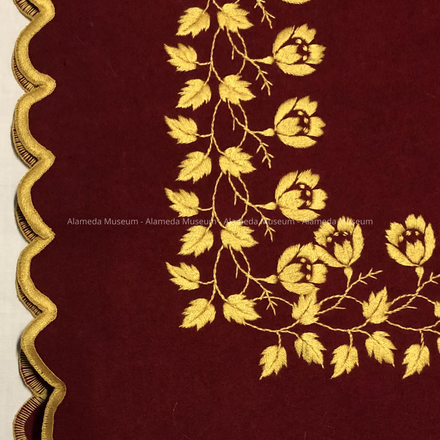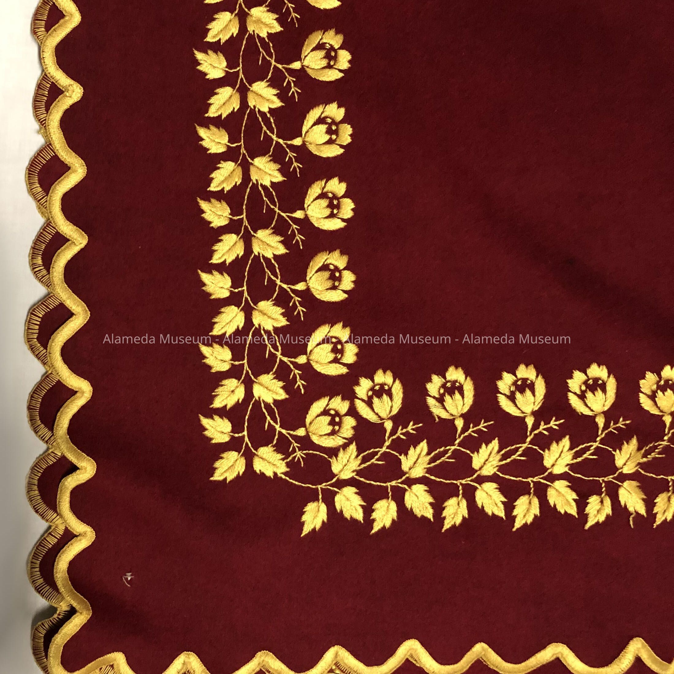 Description: Wine colored wool with scalloped edge and border of floral design in gold colored machine embroidery.