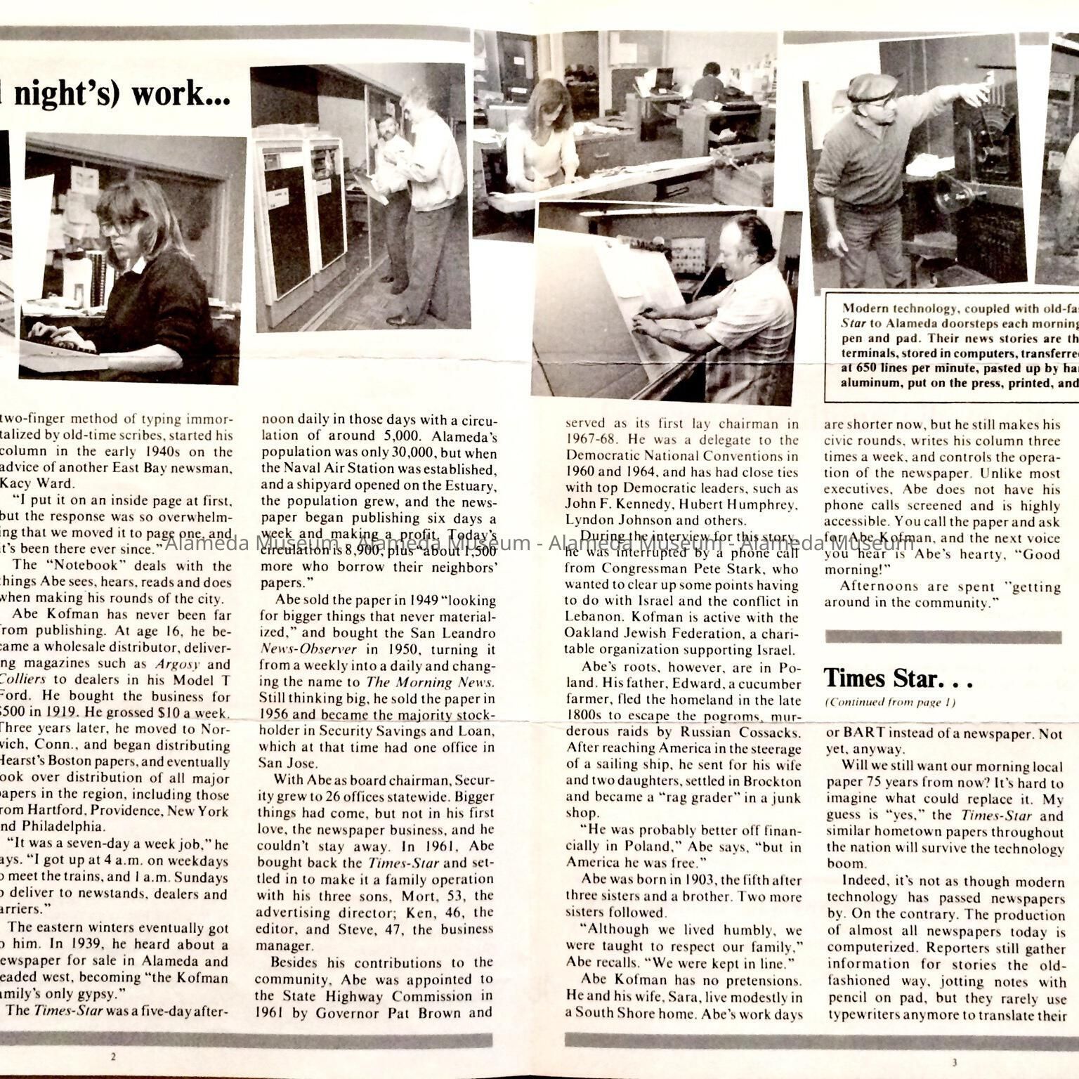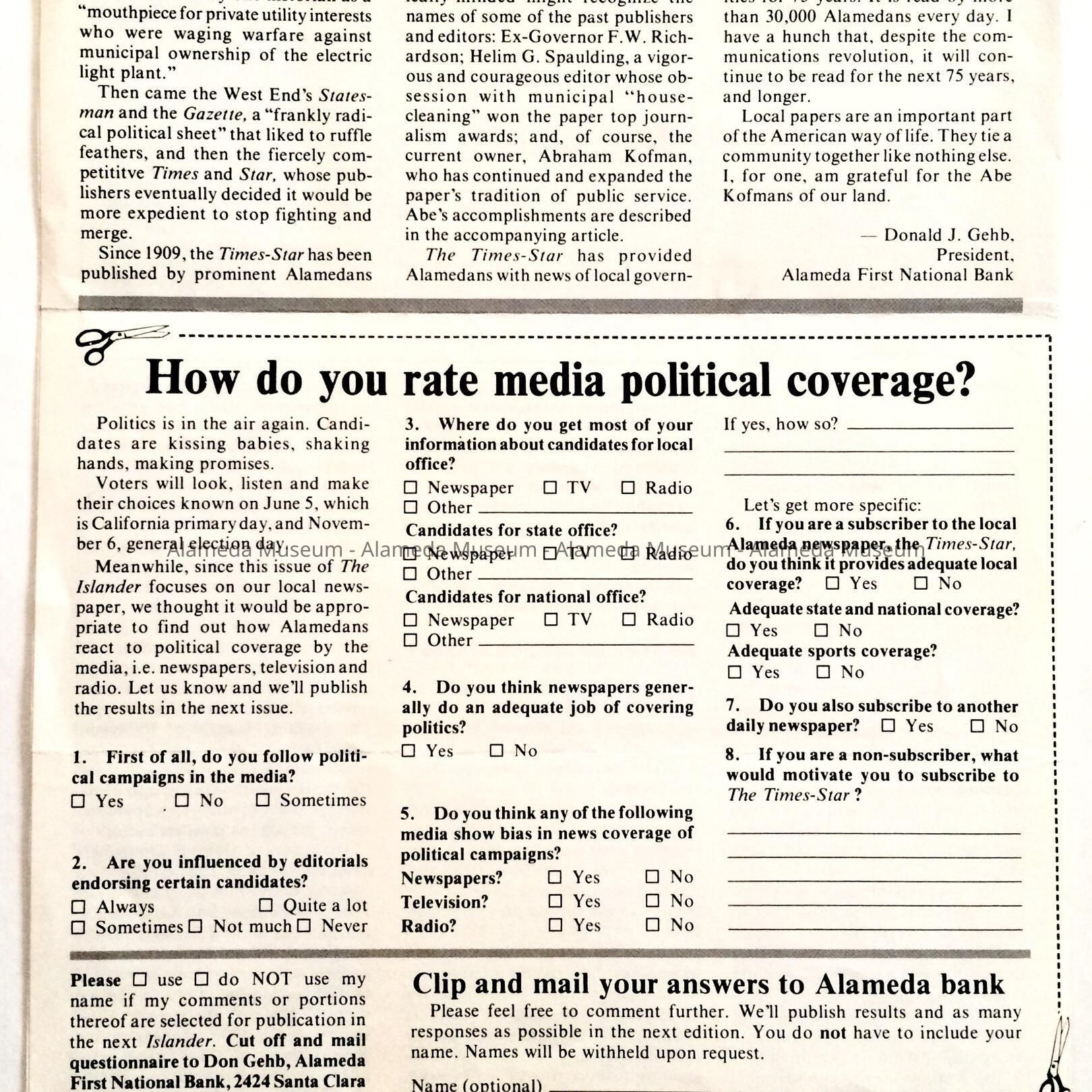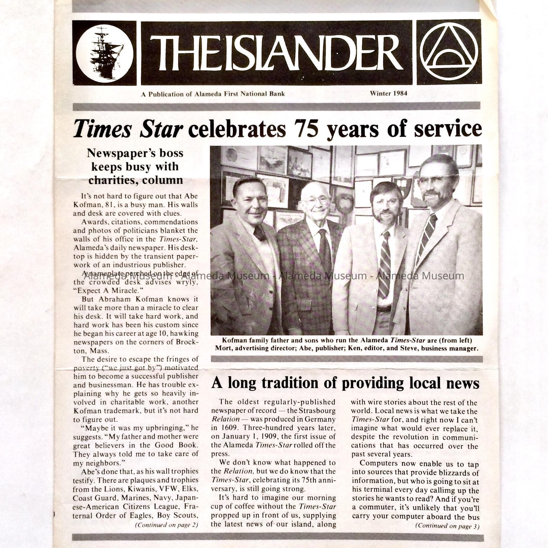 History: Winter 1984 edition of The Islander published by Alameda First National Bank. This particular issue concerns Abe Kofman, late editor of the Alameda Times Star. The article includes biographical information, family portrait, etc.