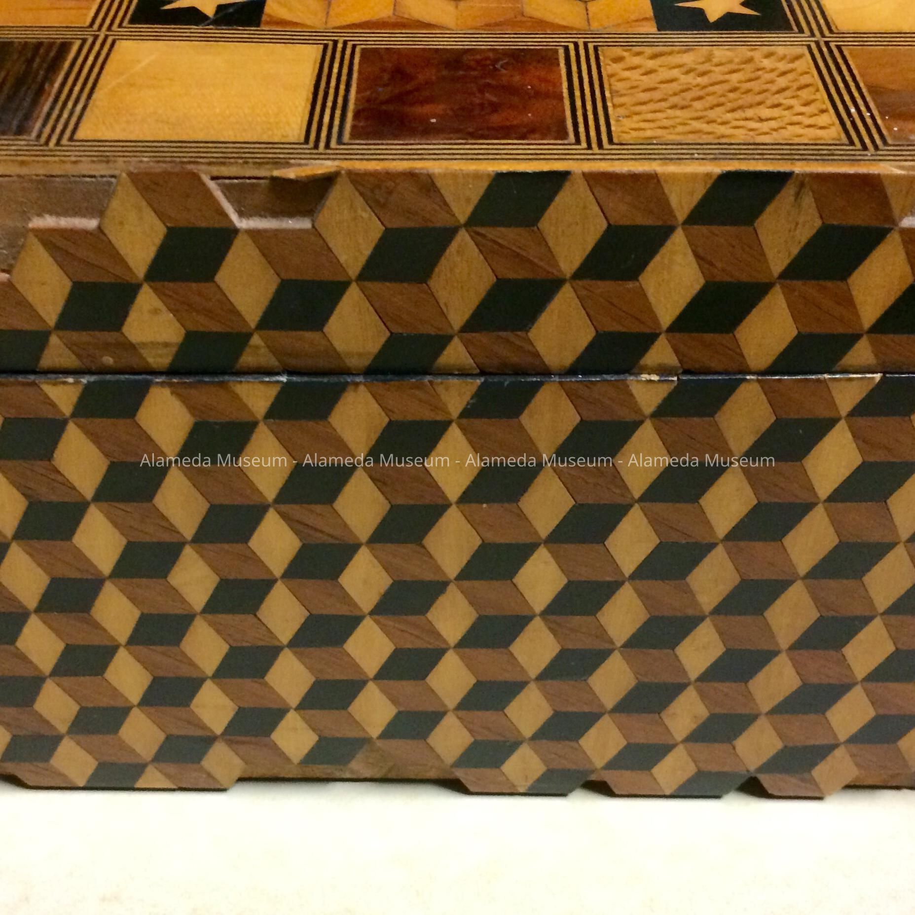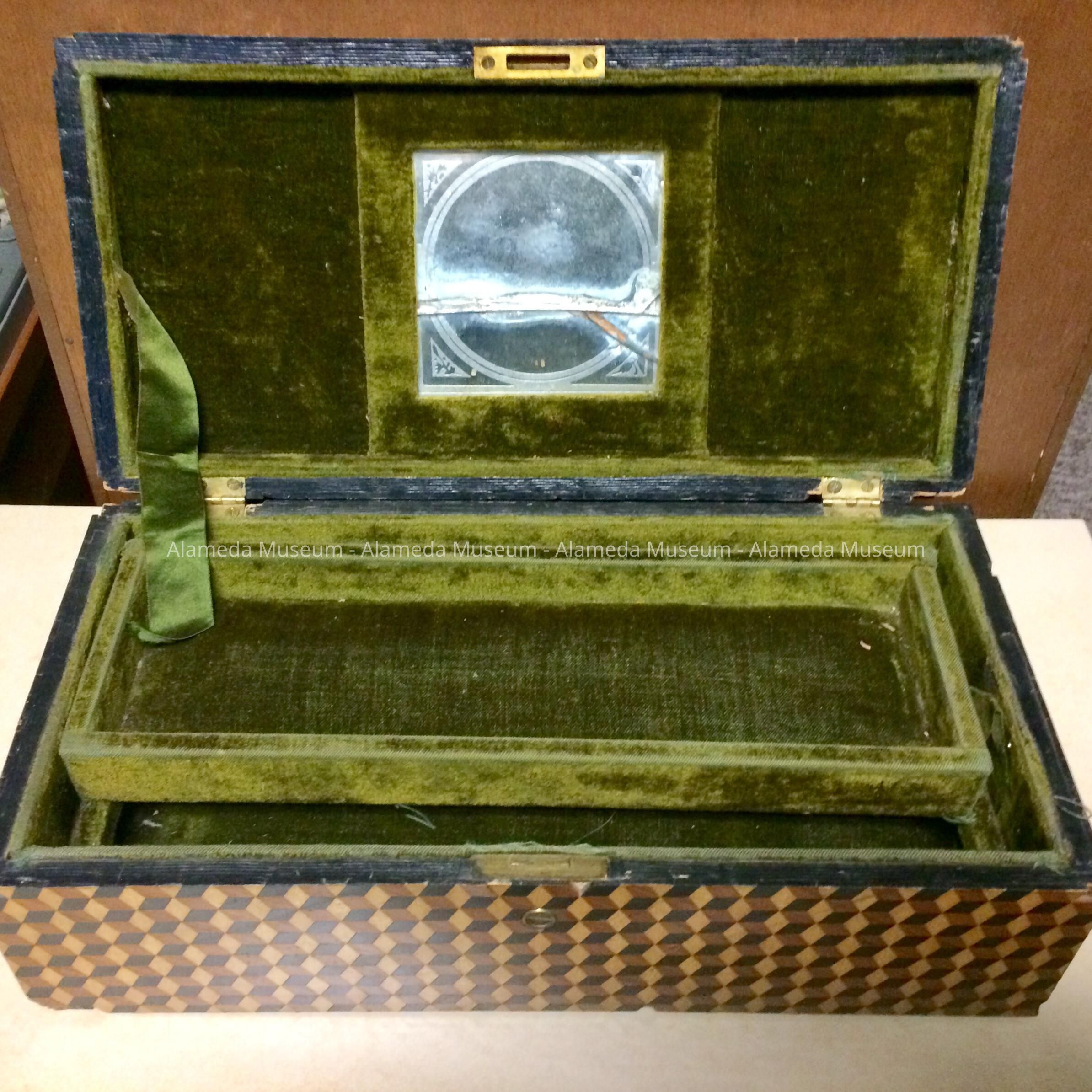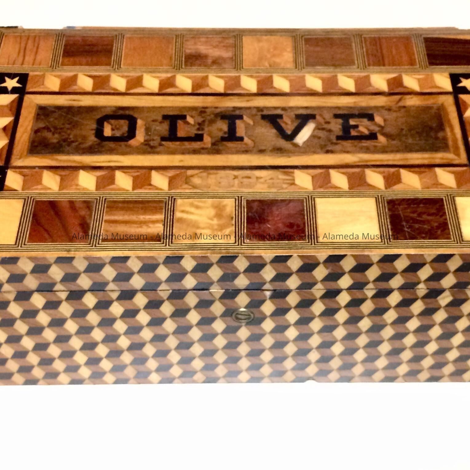 History of Object: A presentation box of folk marquetry that was most likely given to Olive Turner upon her marriage to Frederick W. Toye. The donor is the granddaughter of Adeline Toye Cox, who was the daughter of Frederick W. and Olive Toye. Mr. Toye was a conductor for the South Pacific Coast Railroad. He also commissioned the MacRae Brothers to build their family home at 3210 Encinal Ave., which they occupied from 1890 to 1957.