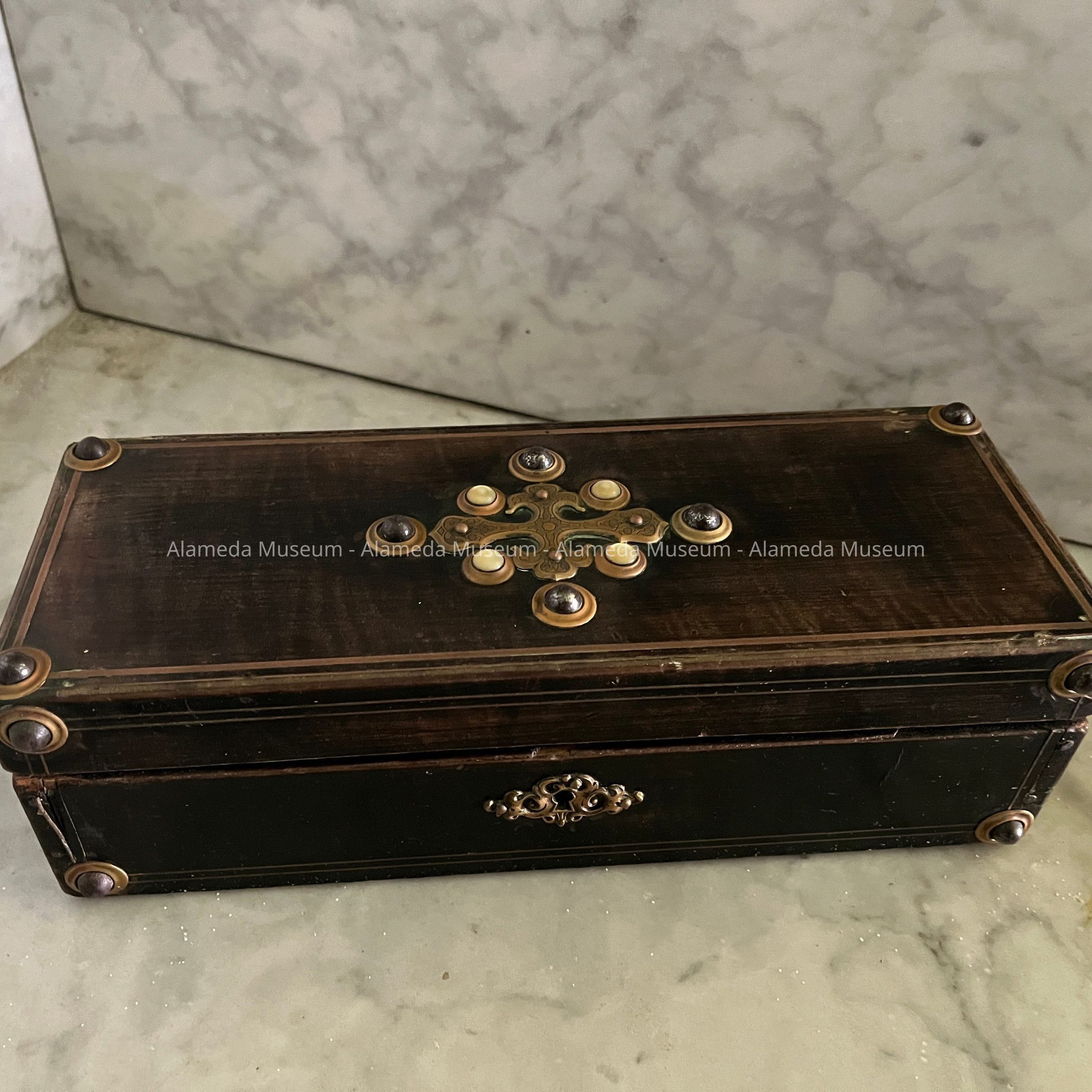 Description: Oblong wooden glove box (hinged lid). Lid decorated with inlay (brass strips), mother-of-pearl & iron like raised buttons. Key locked. Box-curly walnut, rosewood (graining) interior.
