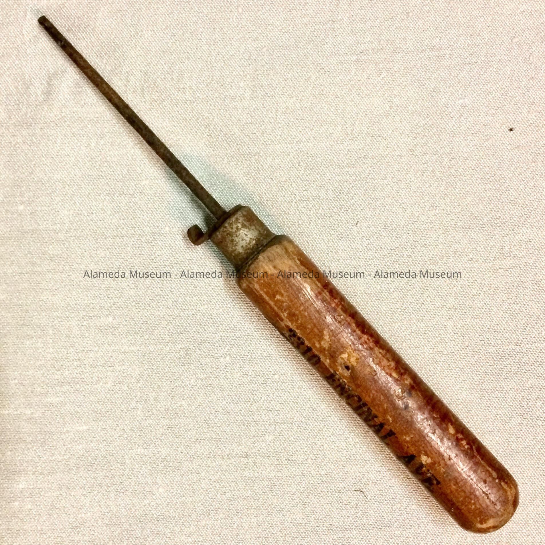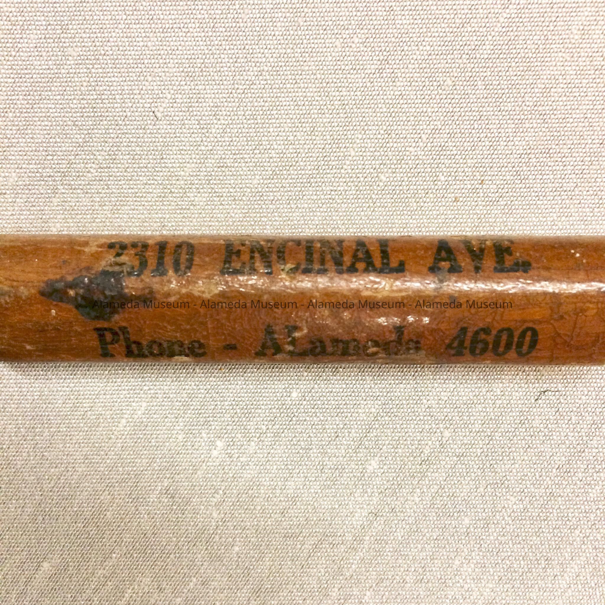 History of Object: A premium ice pick from the "Island City Ice. Co., 2310 Encinal Ave. Phone Alameda 4600". Found in the Fenn residence, 2038 Alameda Ave.