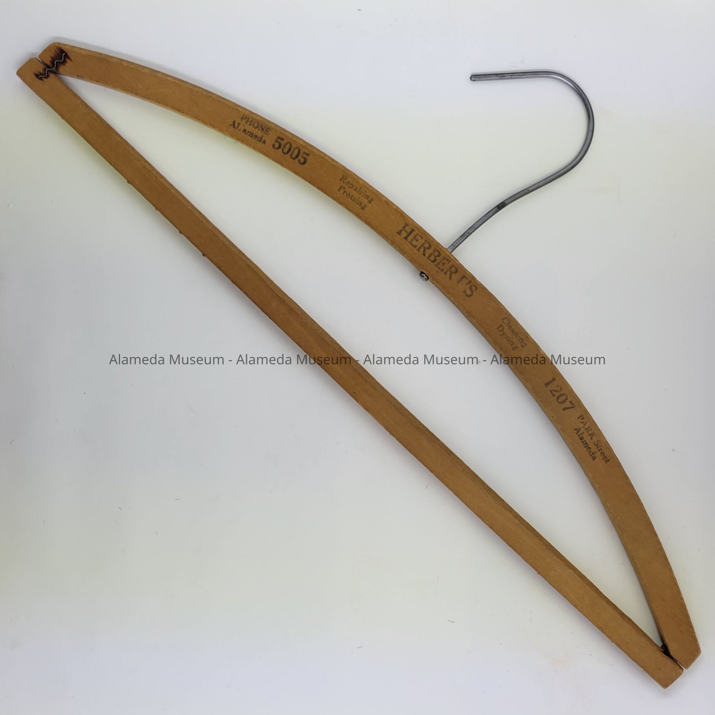 History of Object: A hanger advertising Herbert’s. It also has Repairing, Pressing, Cleaning, Drying, 1207 Park St, Alameda and phone Alameda 5005 printed on it.