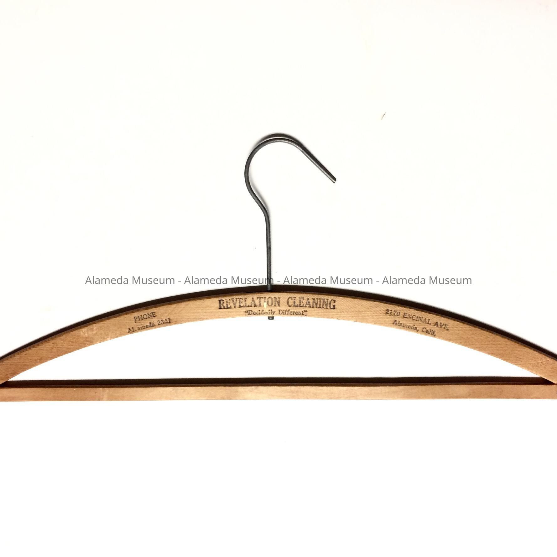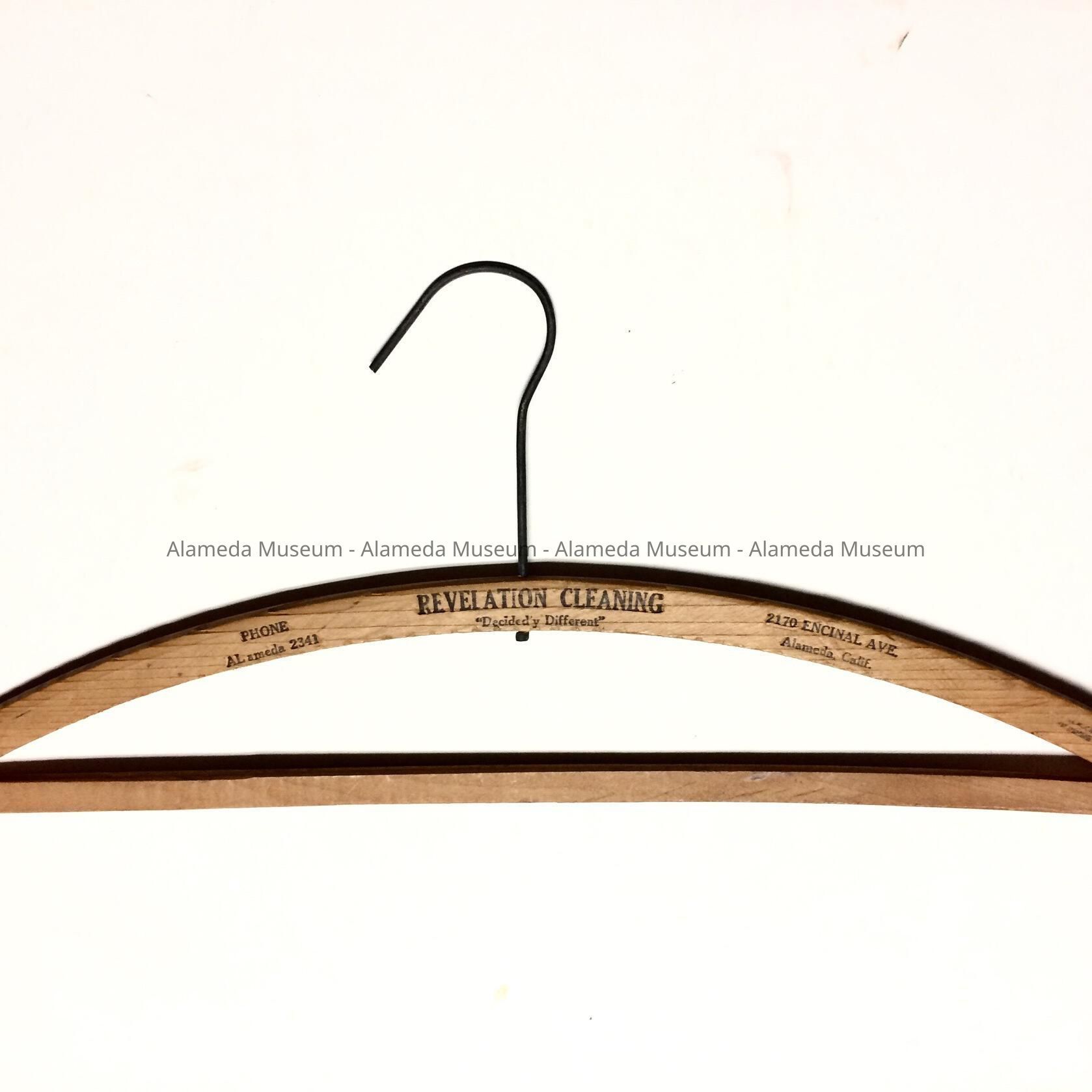 A WOODEN HANGER ADVERTISING REVELATION CLEANERS, 2170 ENCINAL AVENUE, ALAMEDA; TELEPHONE AL-2341.