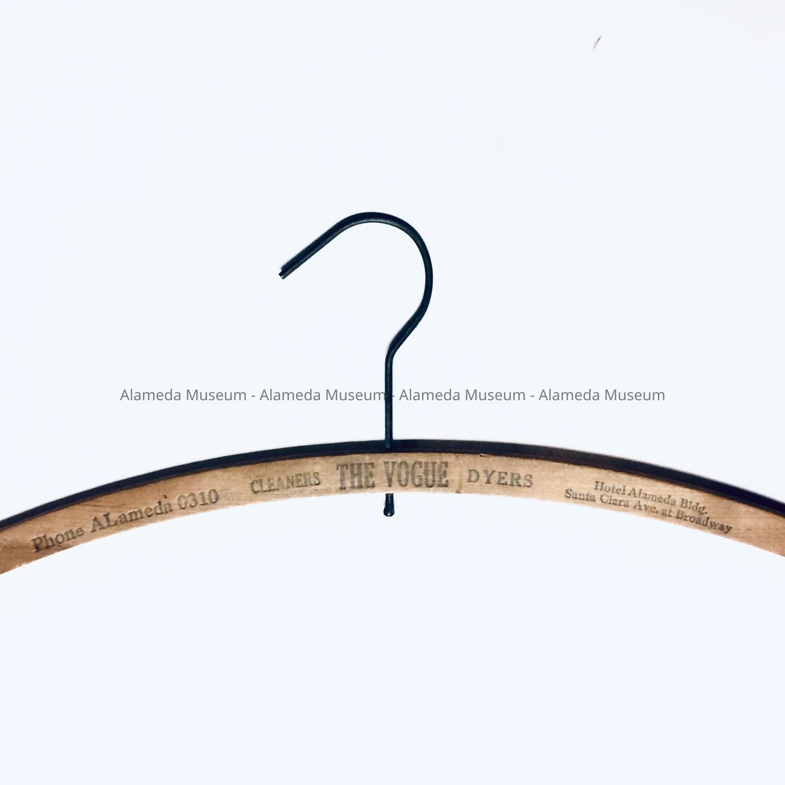 A WOODEN HANGER ADVERTISING THE VOGUE CLEANERS AND DYERS, HOTEL ALAMEDA BLDG, SANTA CLARA AT BROADWAY, ALAMEDA; TELEPHONE AL-0310.