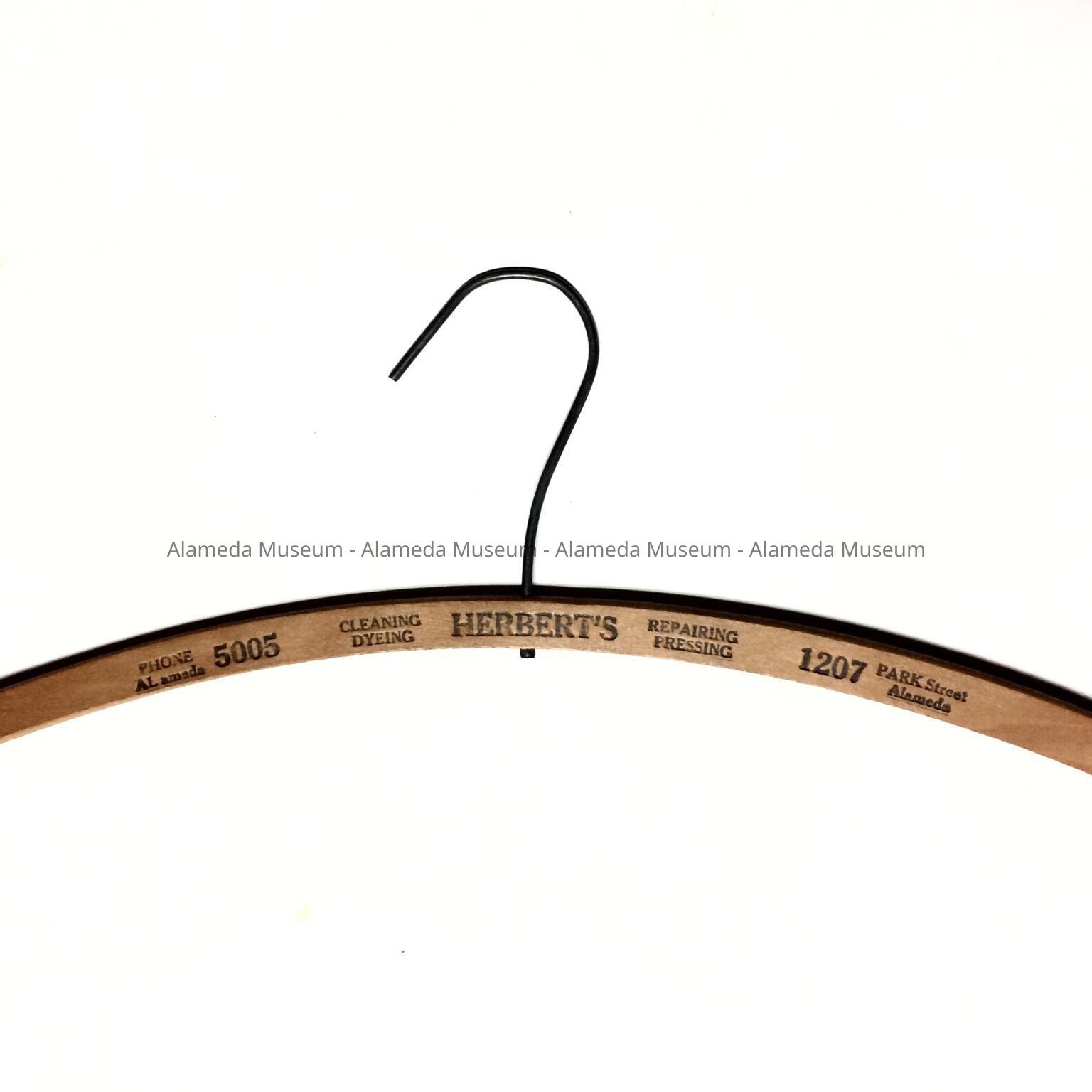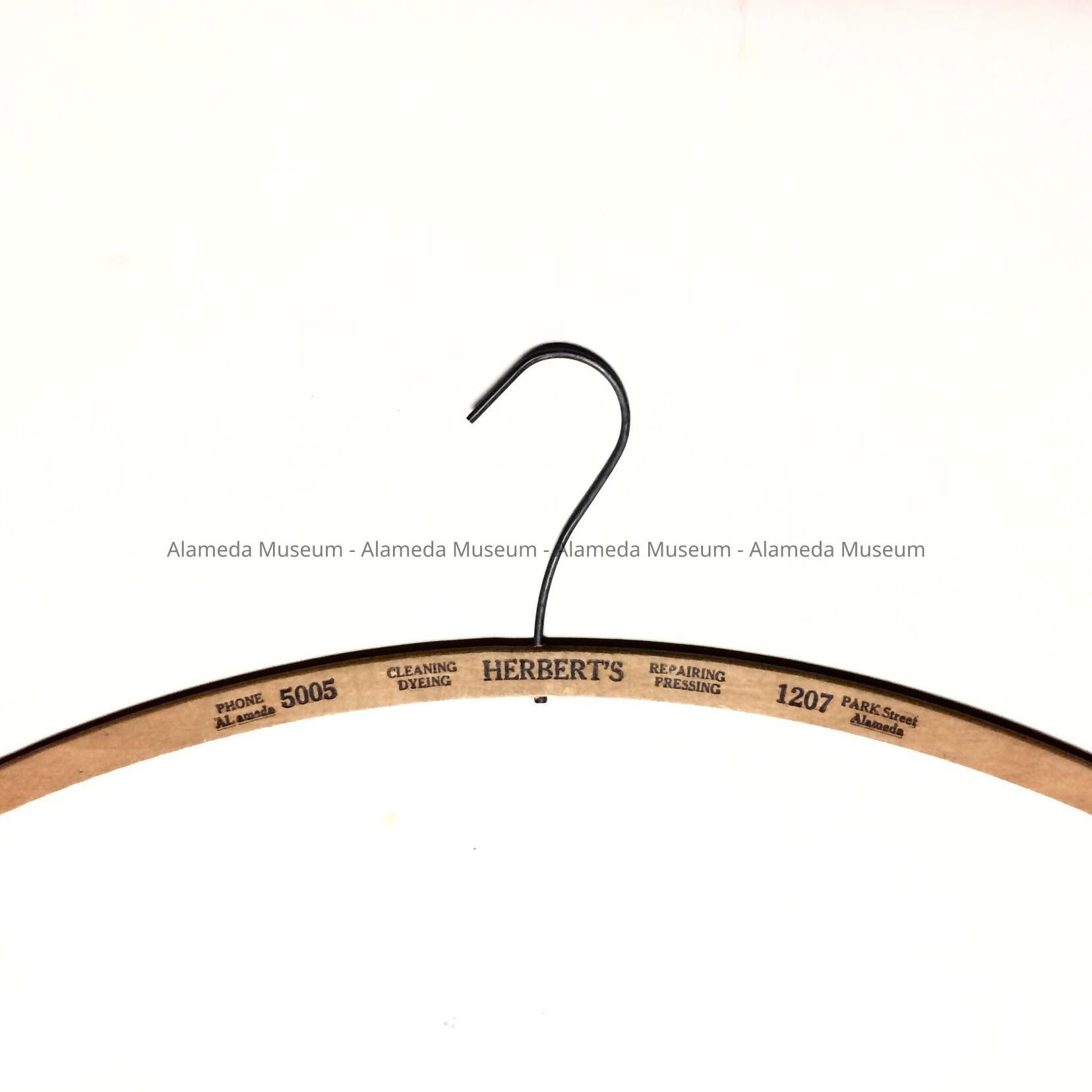 HISTORY OF OBJECT: HANGERS FROM HERBERT'S DRY CLEANERS, 1207 PARK STREET, ALAMEDA; TELEPHONE AL 5005.