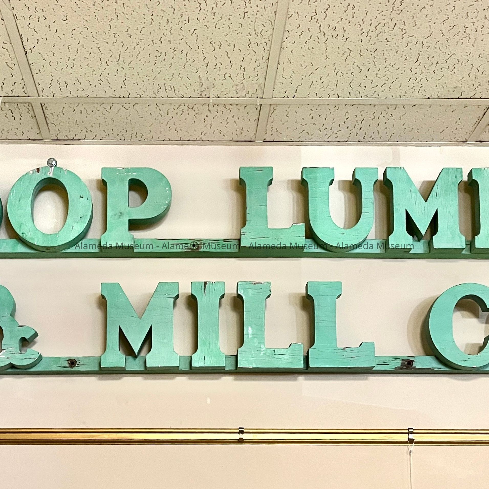 Description: sign, currently painted a blue-green, composed of individual wooden letters mounted on a long wooden piece of wood about 1 1/2 inch square, forming the name ‘Loop Lumber & Mill Co.’ New metal eye hooks are screwed into the second ‘I’, the ‘B’, the ‘&’ and the final ‘O’, to accommodate hanging.