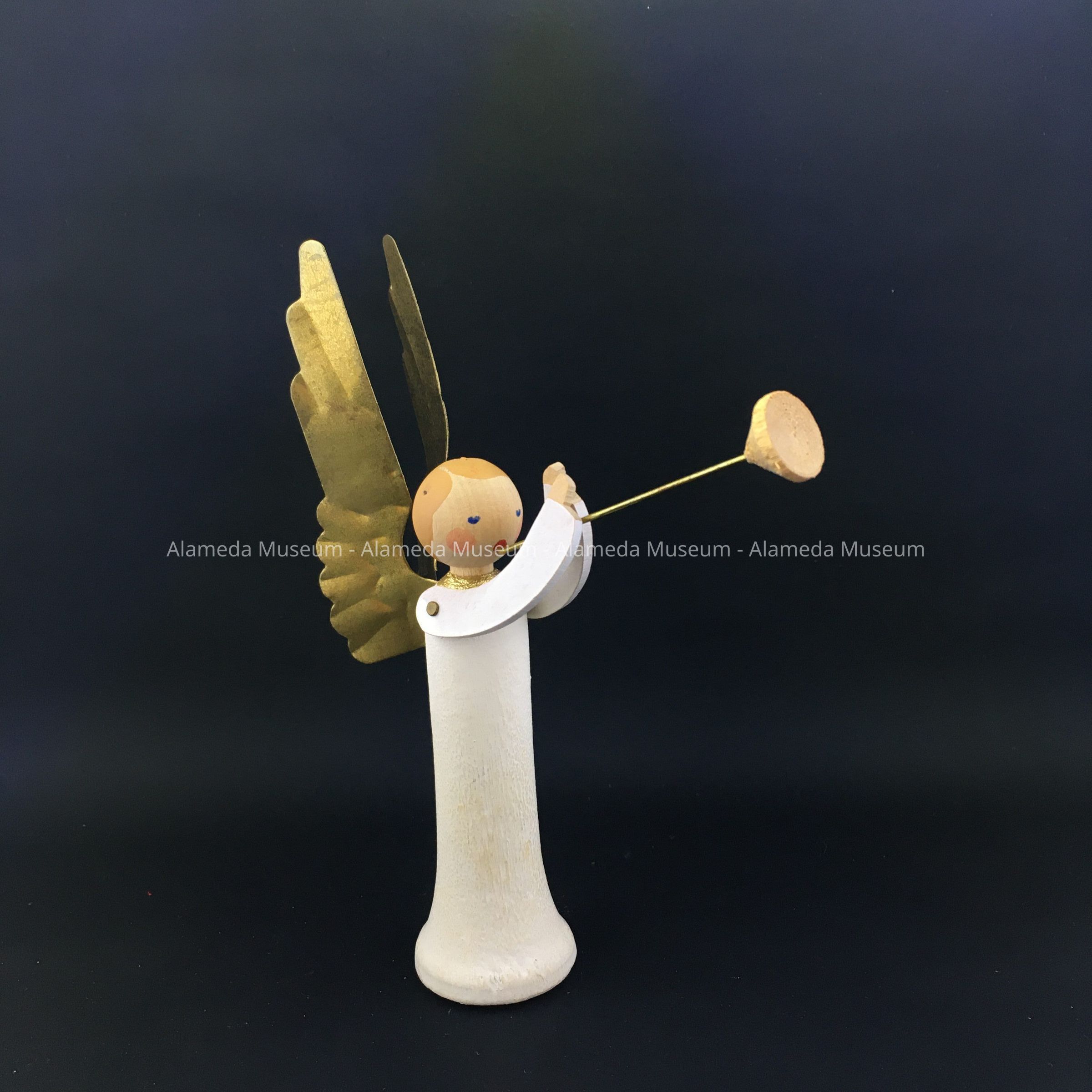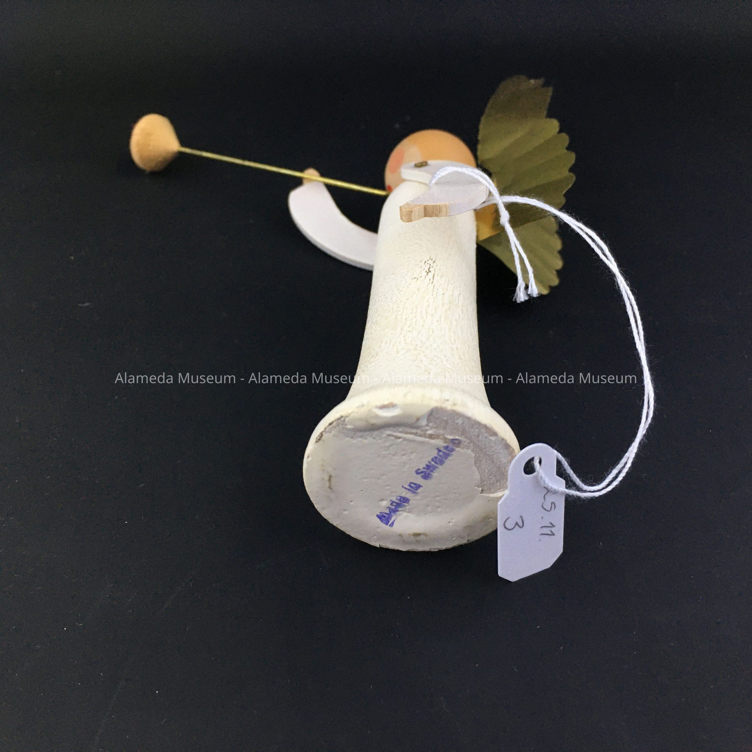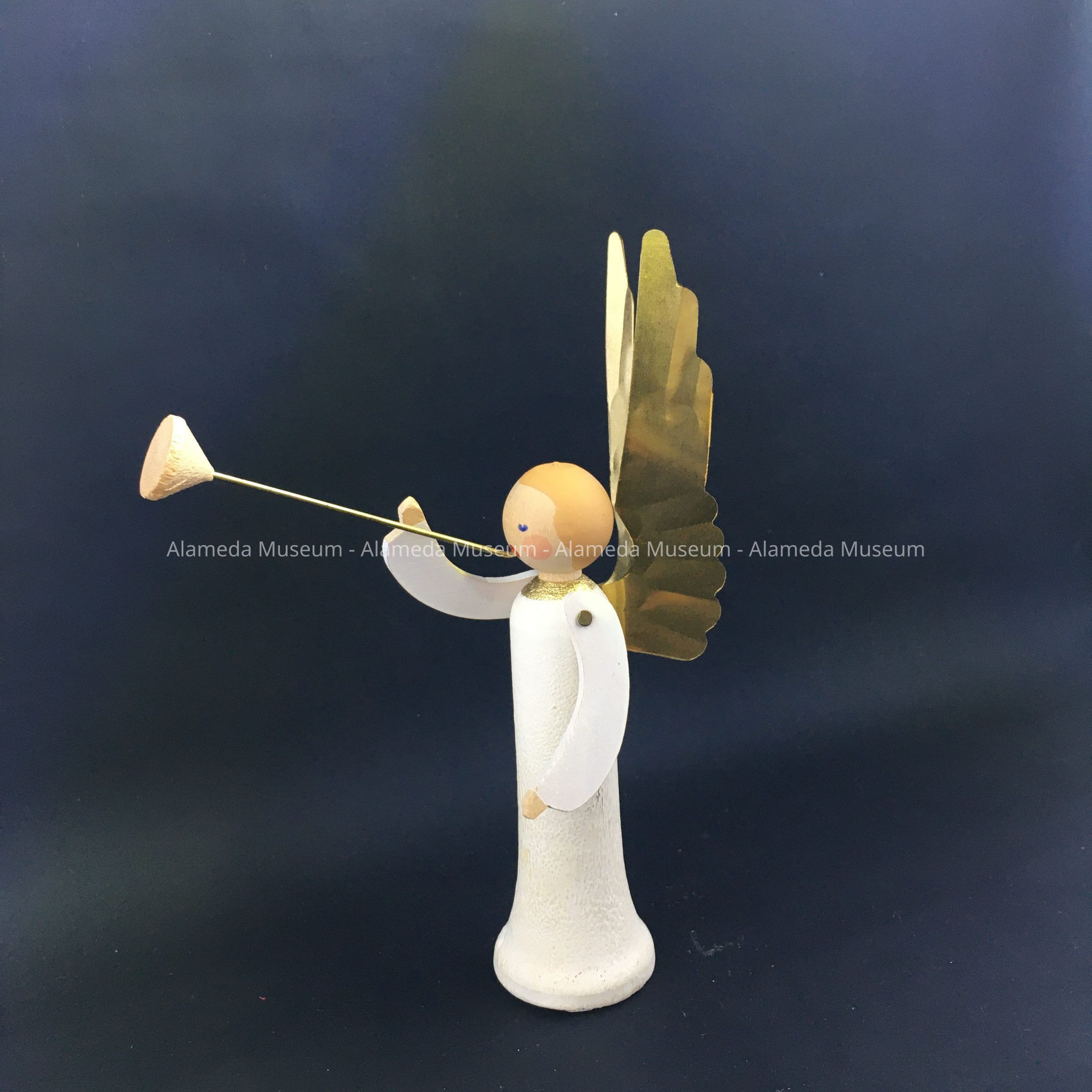 Description: ornament made of wood and thin yellow- or gold-colored metal, forming the figure of a stylized angel blowing a trumpet with long stem. The angel’s arms are thin pieces of wood, attached to the body with small nails, allowing the arns to move. Marked at the bottom ‘Made in Sweden’.