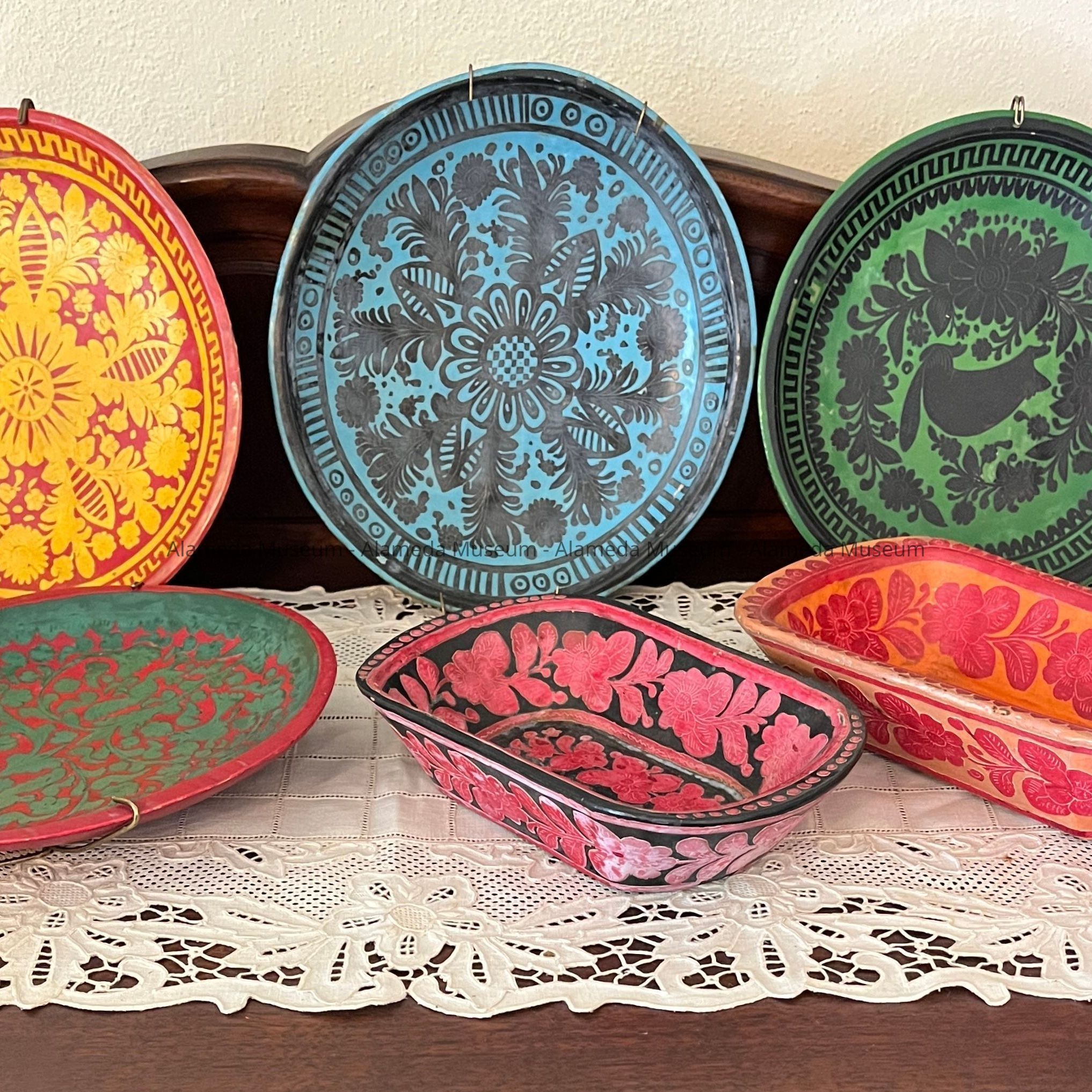 Description: A series of decorative ethnic art bowls composed of soft wood that has hand painted and decorated with elaborate cut-out paper designs. Their surfaces appear to be varnished. Collection consists of plates - 9, bowls -5, deep bowls - 2, and oblong bowls - 2. Sizes: various