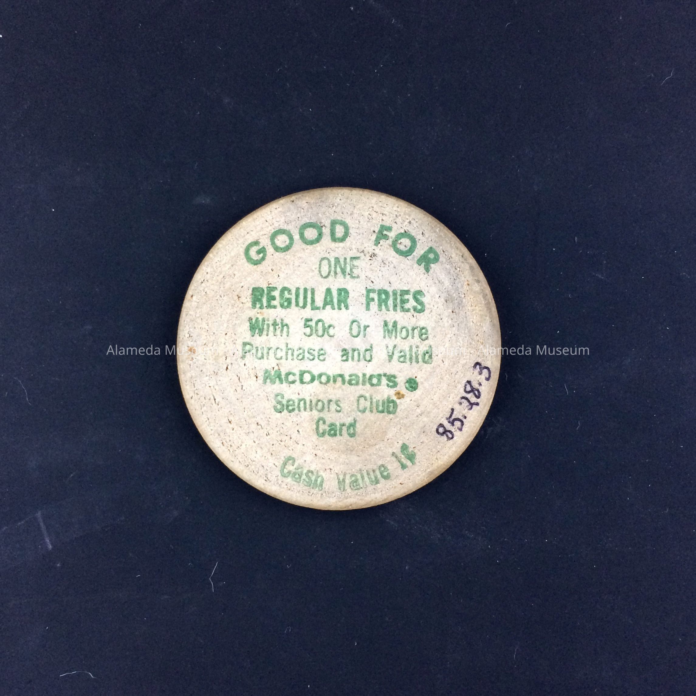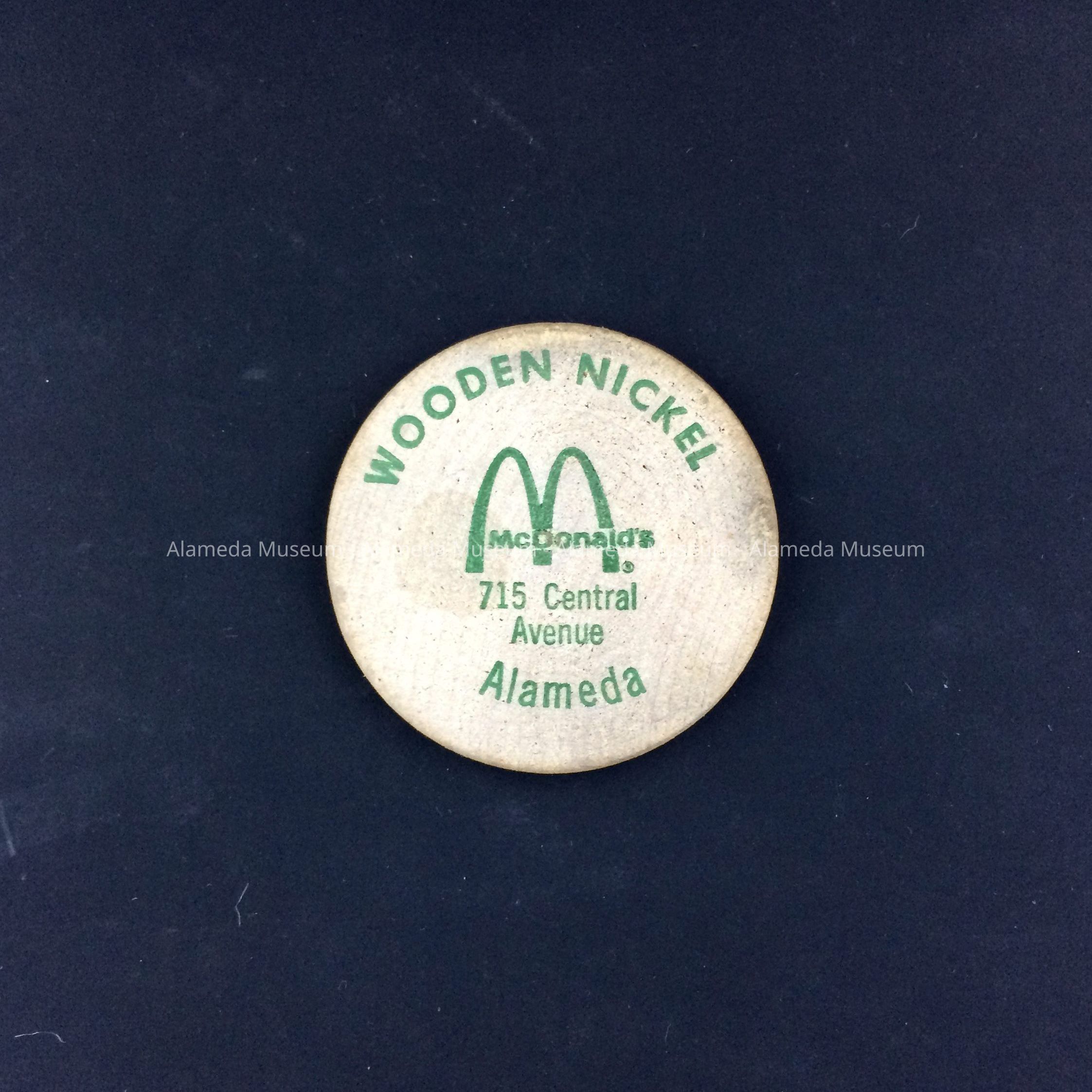 Description: Circular wooden nickel with printed advertising stating (in green colored type) "Wooden Nickel, McDonald's, 715 Central Avenue, Alameda," on the reverse side "Good For one Regular Fries with 50 cents or more purchase and valid McDonald's Seniors Club Card."