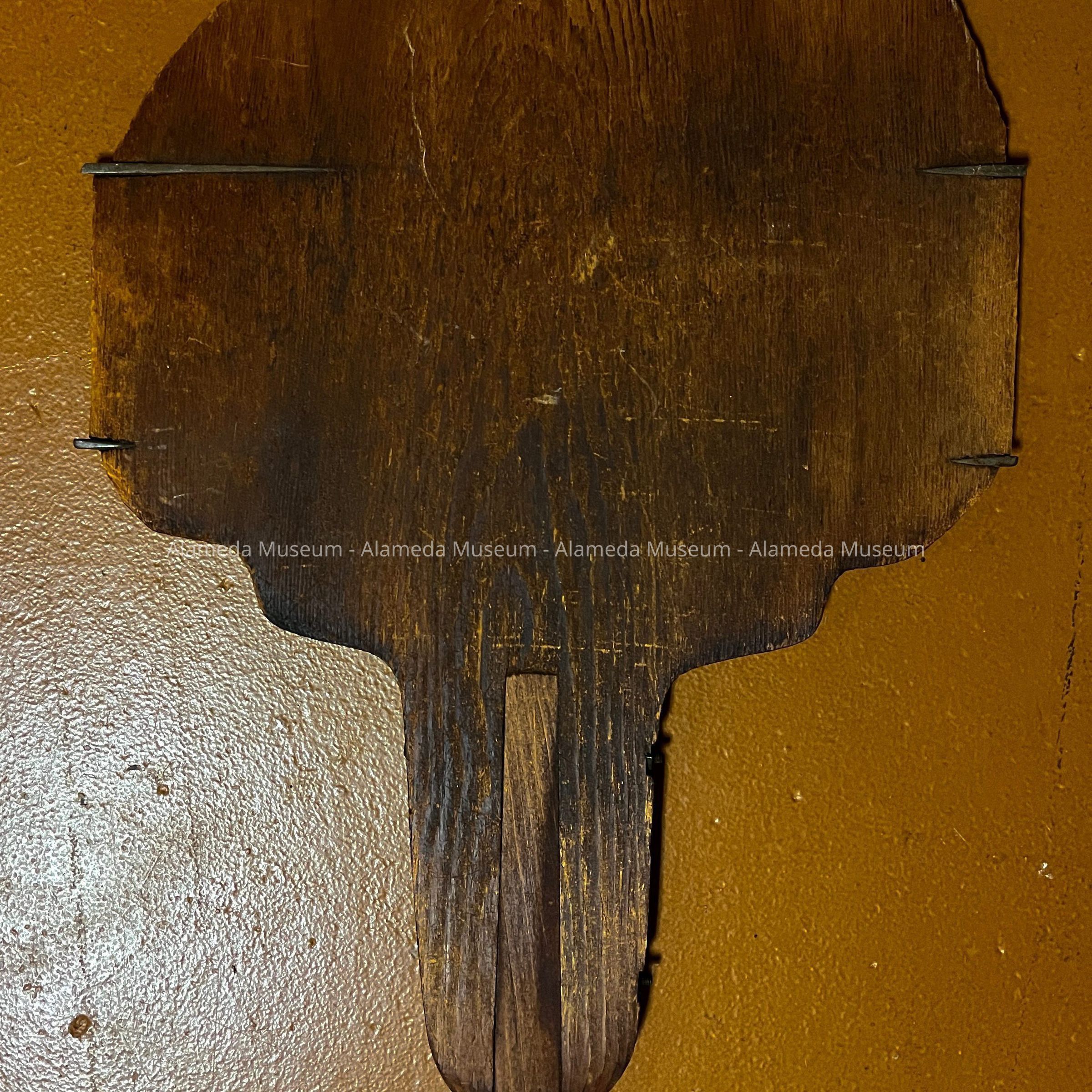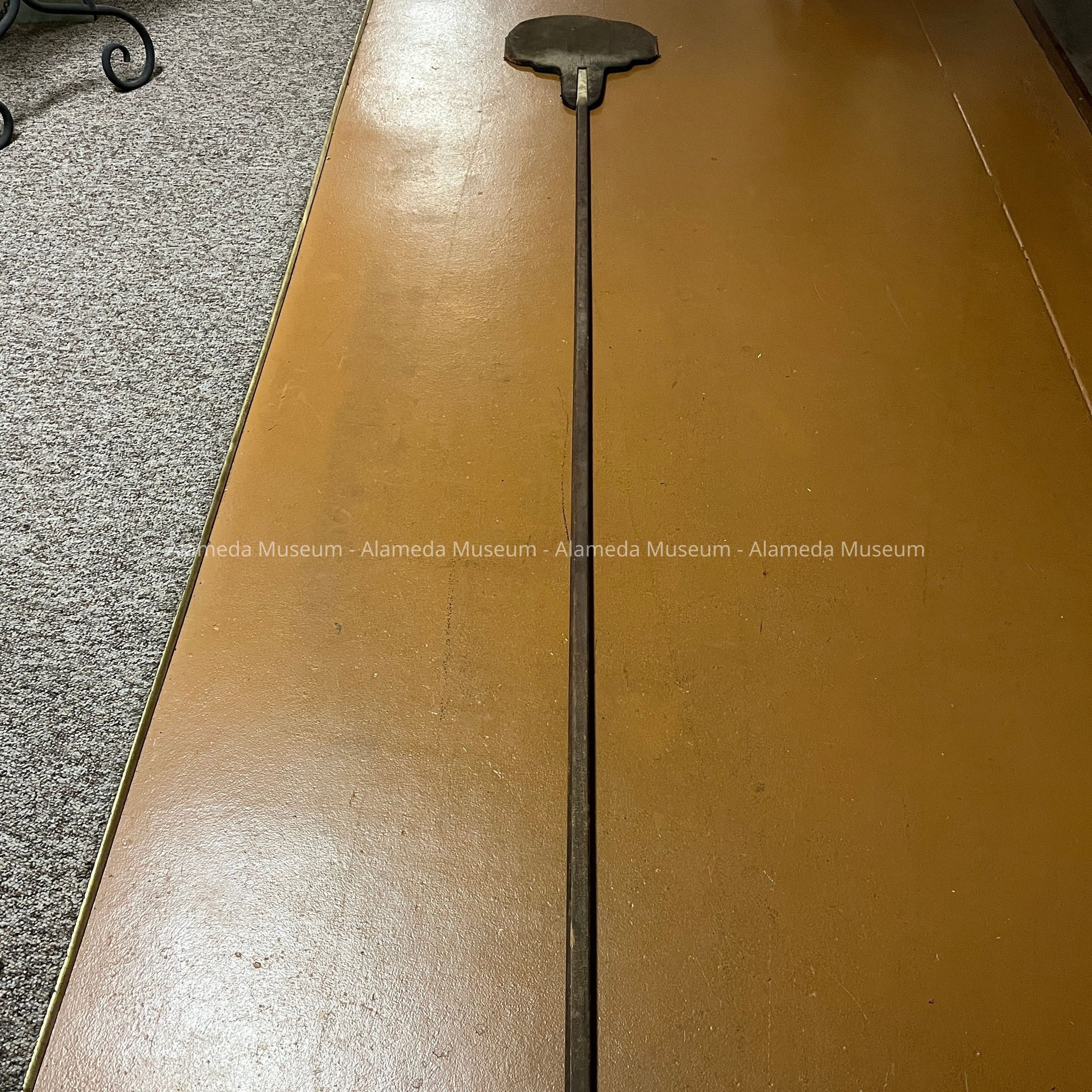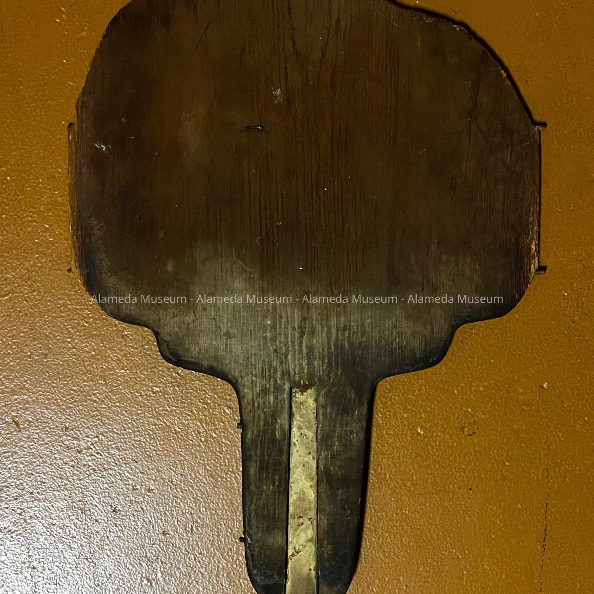 Description: an unpainted wooden object with very long handle and flat section at the end. Dark scorch marks on handle.