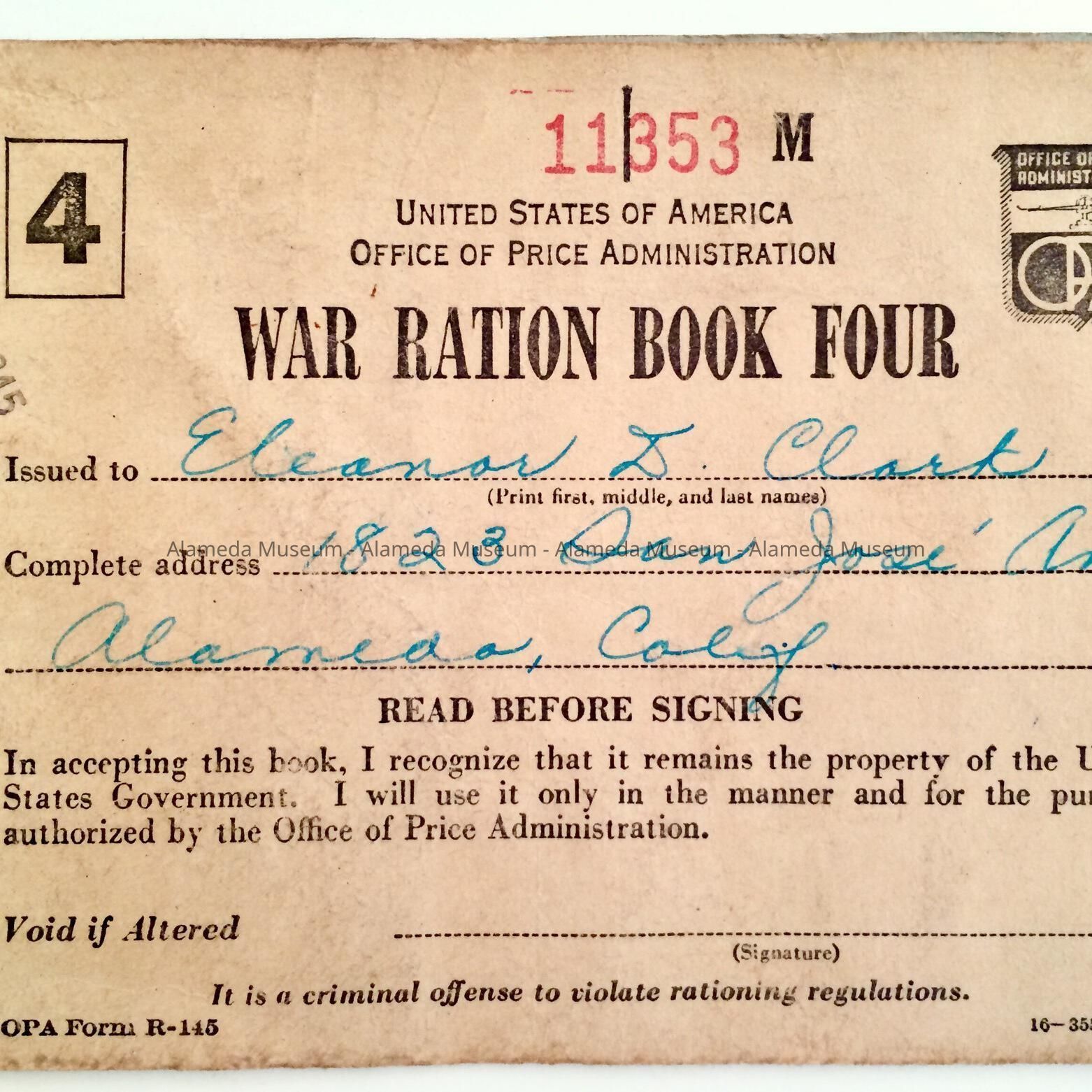 Description: Soft covered booklet, with three pages of stamps, green blue, and black. Cover it has the name of the person to whom the stamps were issued, written in blue ink. "Eleanor D. Clark, 1823 San Jose Avenue, Alameda."