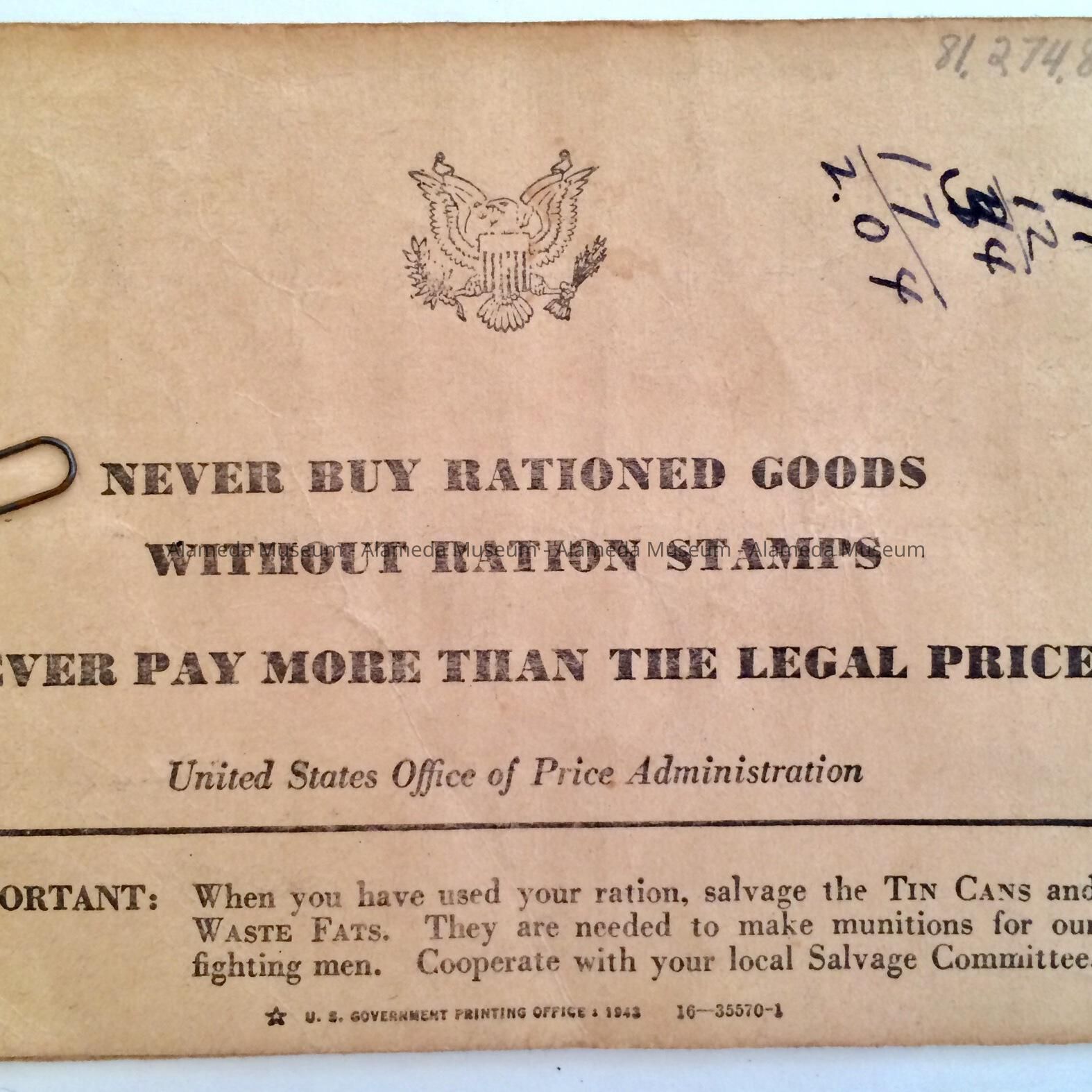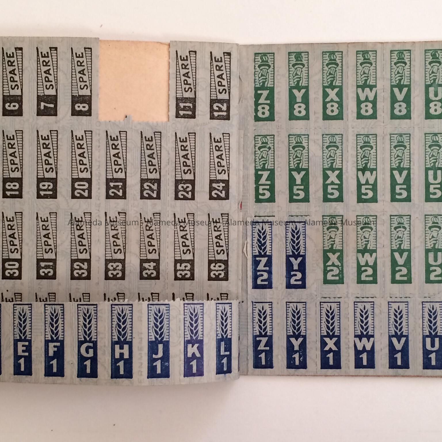 History of Object: Stamps issued during World War II, food, meat, fruit, et cetera, which were rationed. Issued in Alameda, January 29th, 1945.