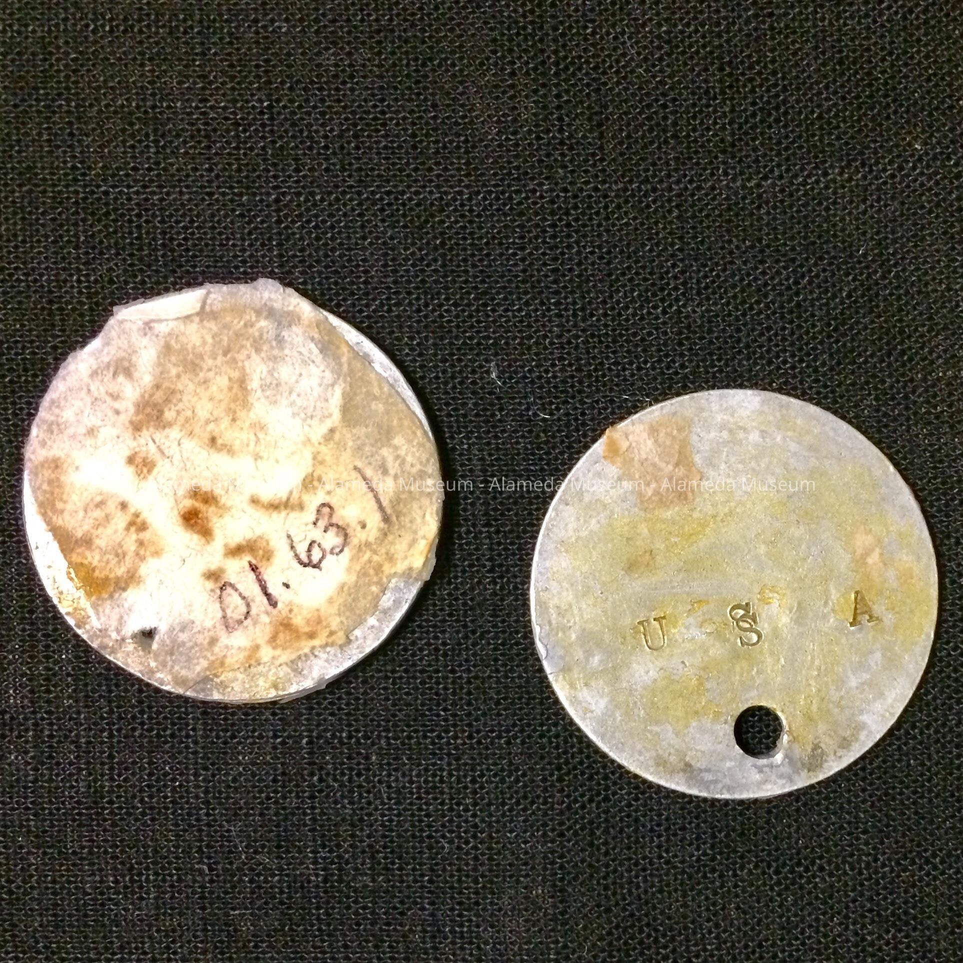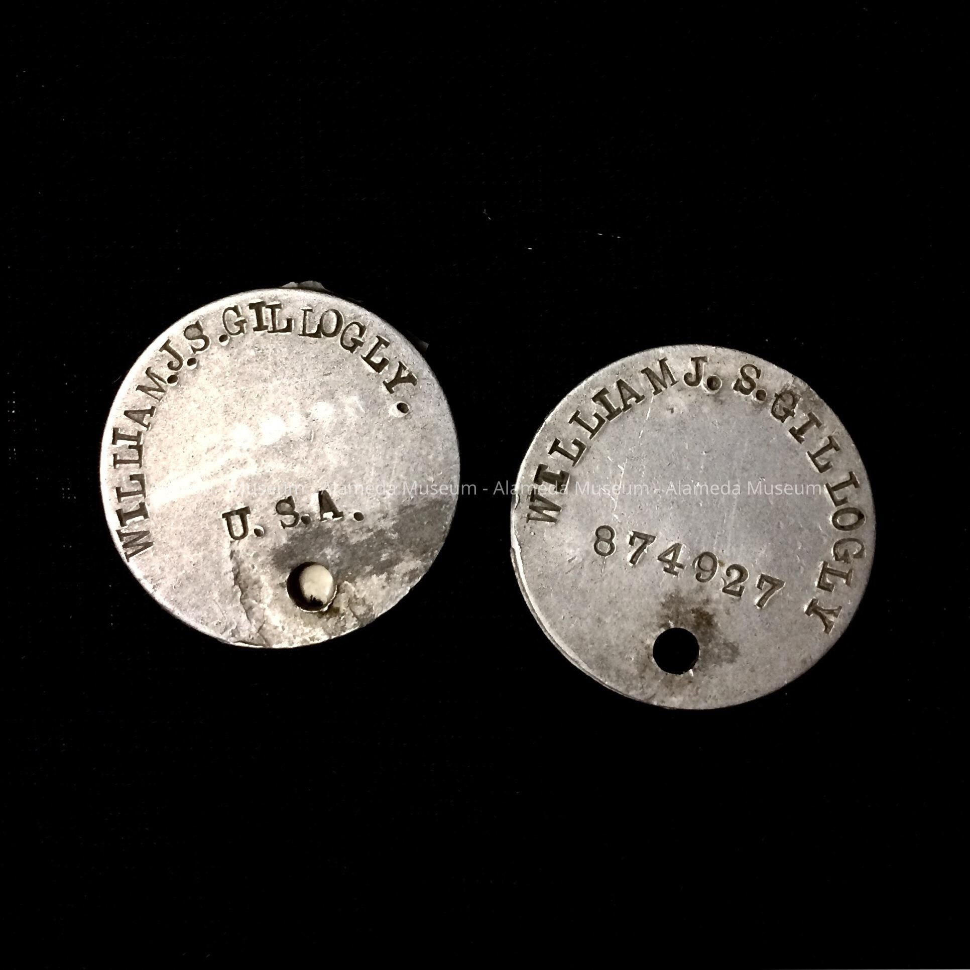 HISTORY OF OBJECT: IDENTIFICATION TAG WORN BY WJ S GILLOGLY DURING WW-I. THE GILLOGLY FAMILY LIVED ON BUENA VISTA AVENUE IN ALAMEDA, CA.