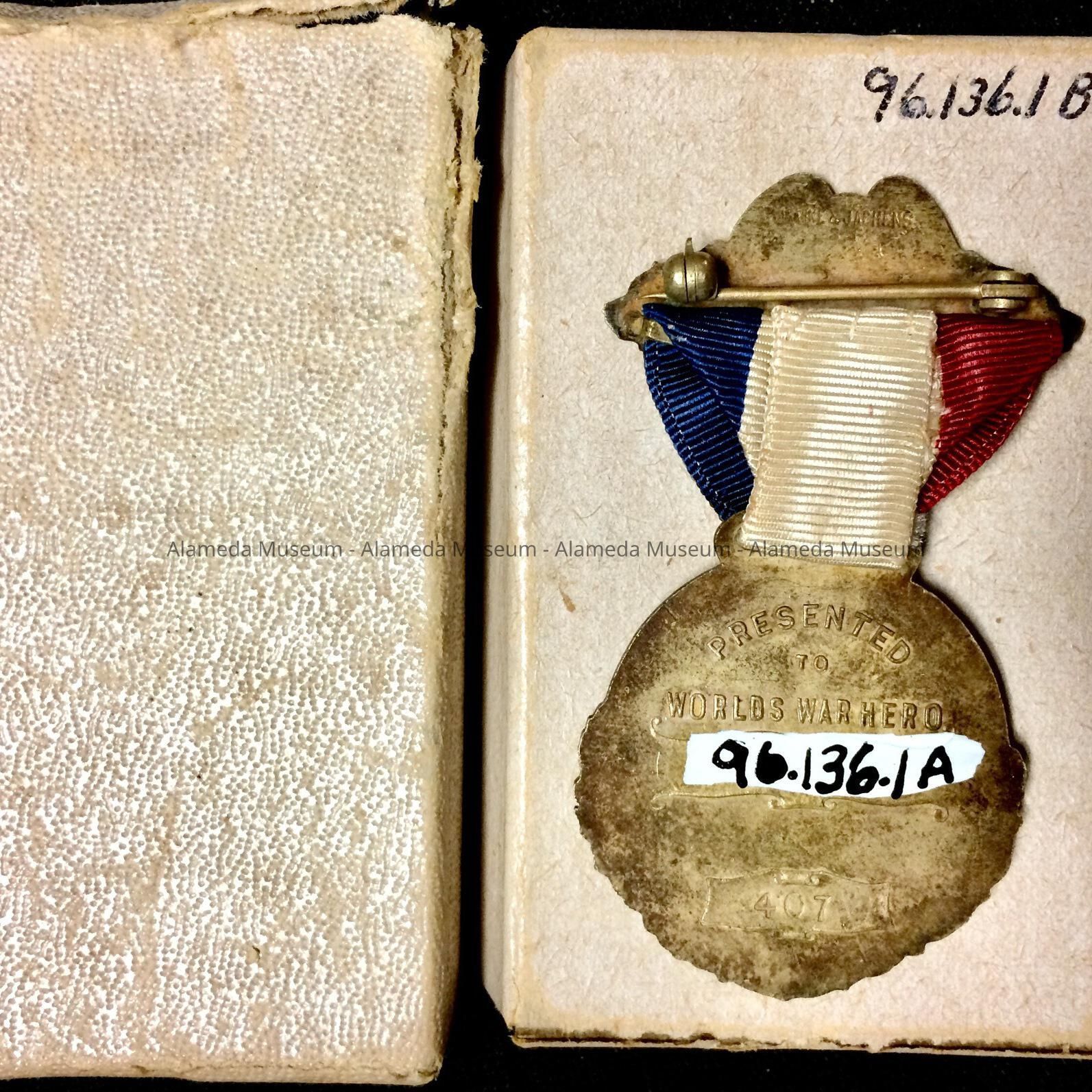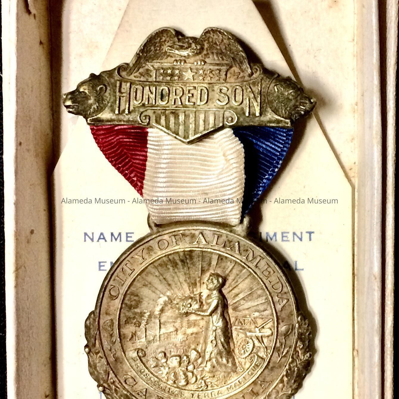 MEDAL ISSUED BY THE CITY OF ALAMEDA TO RETURNING SERVICEMEN FOLLOWING WORLD WAR I. MEDAL WAS ISSUED IN 1919.