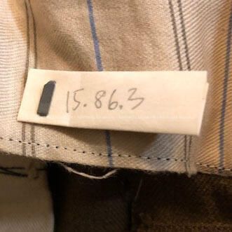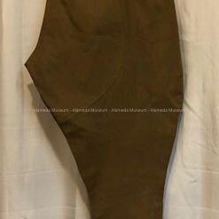 3/4-LENGTH MILITARY PANTS. OPENING IS SECURED BY BUTTONS. KHAKI-COLORED IN WHAT APPEARS TO BE PLASTIC BUTTONS. THE INTERIOR WAISTBAND IS LINED WITH COTTON TICKING IN STRIPES. THE BUTTOCK SECTION IS REINFORCED WITH MATCHING FABRIC IN KHAKI COLOR.