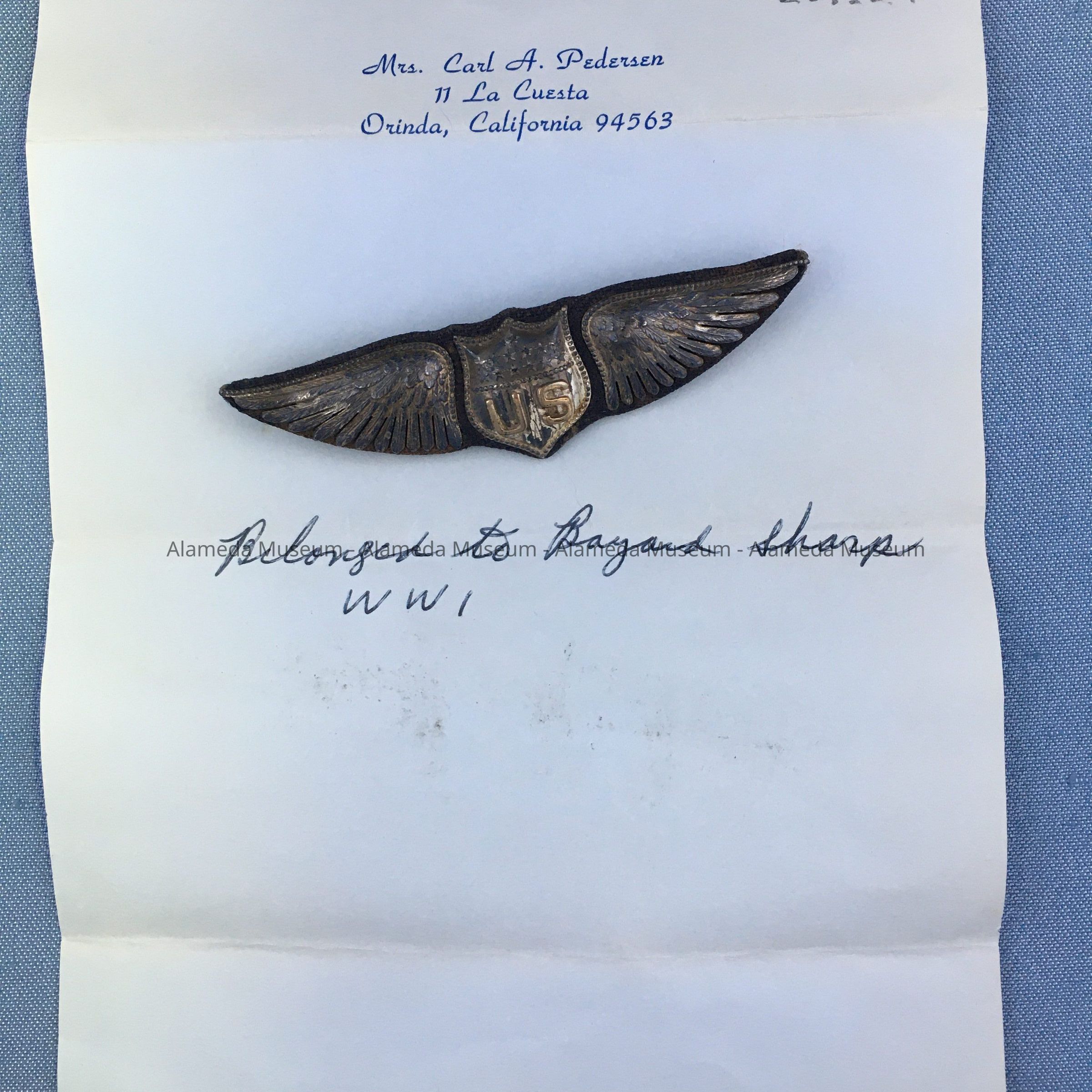 History of Object: Set of World War I wings earned by Bayard Sharp. Bayard Sharp is listed as 'Lieut.' on the list of 'honored son' medal receivers (16.53.28). He was a grandson of Dr. Henry Gibbons, early resident of Alameda, and a nephew of Emilie Cohen, of the Fernside Cohens, and lived until at least the 1940s in Alameda.