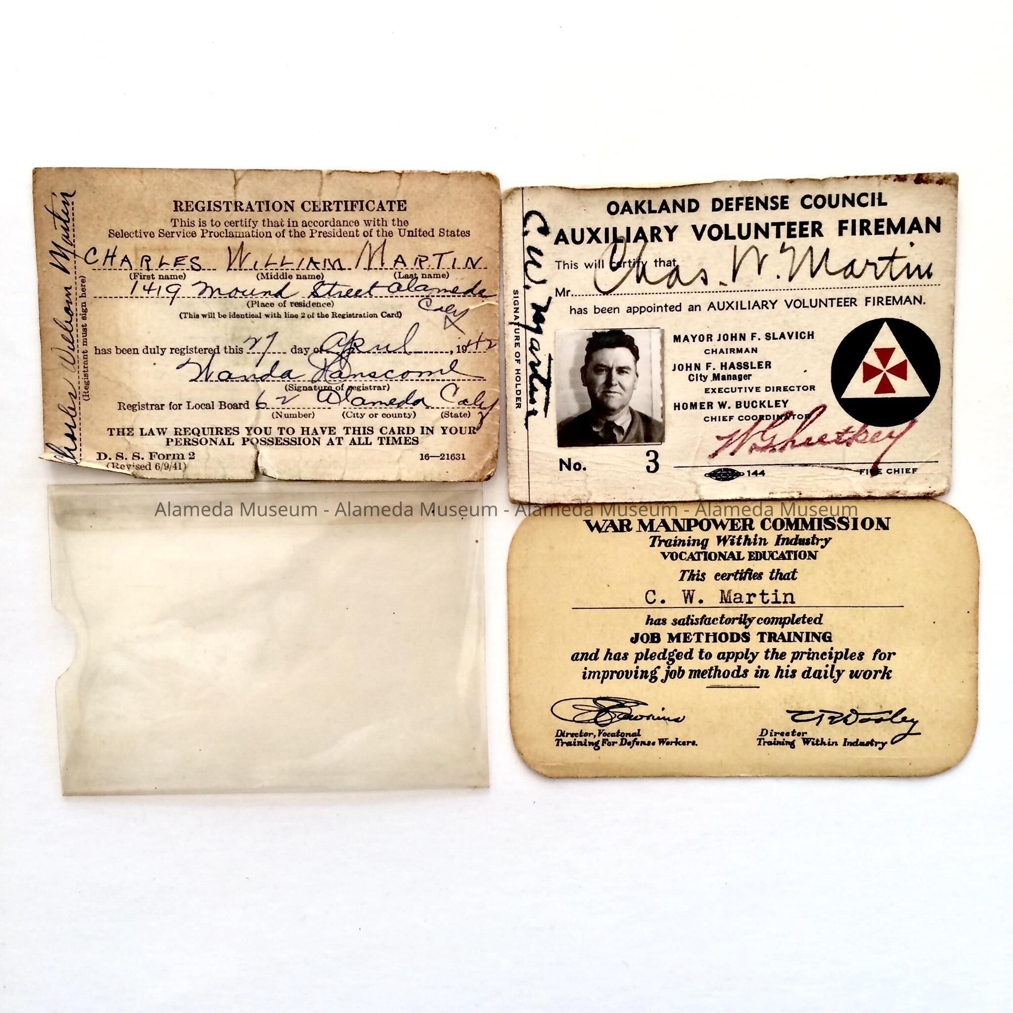 History of Object: WWII draft registration card, Oakland Civil Defense ID card, and Job training card of Charles William Martin. Re A: from the fourth draft, also referred to as 'Old Man's Registration', conducted on April 27, 1942, for all men age 45-64. The purpose was to collect information on industrial capacity and skills.