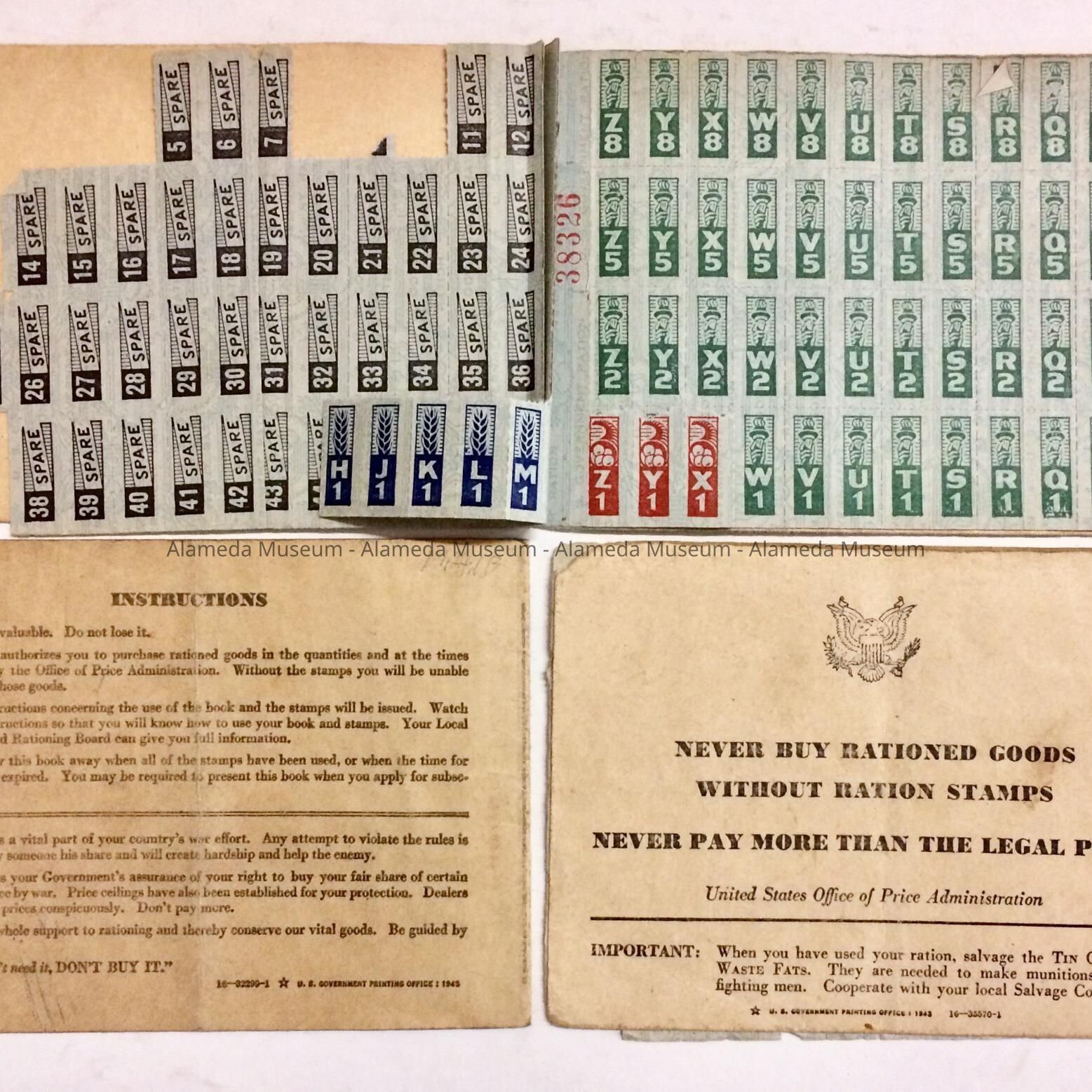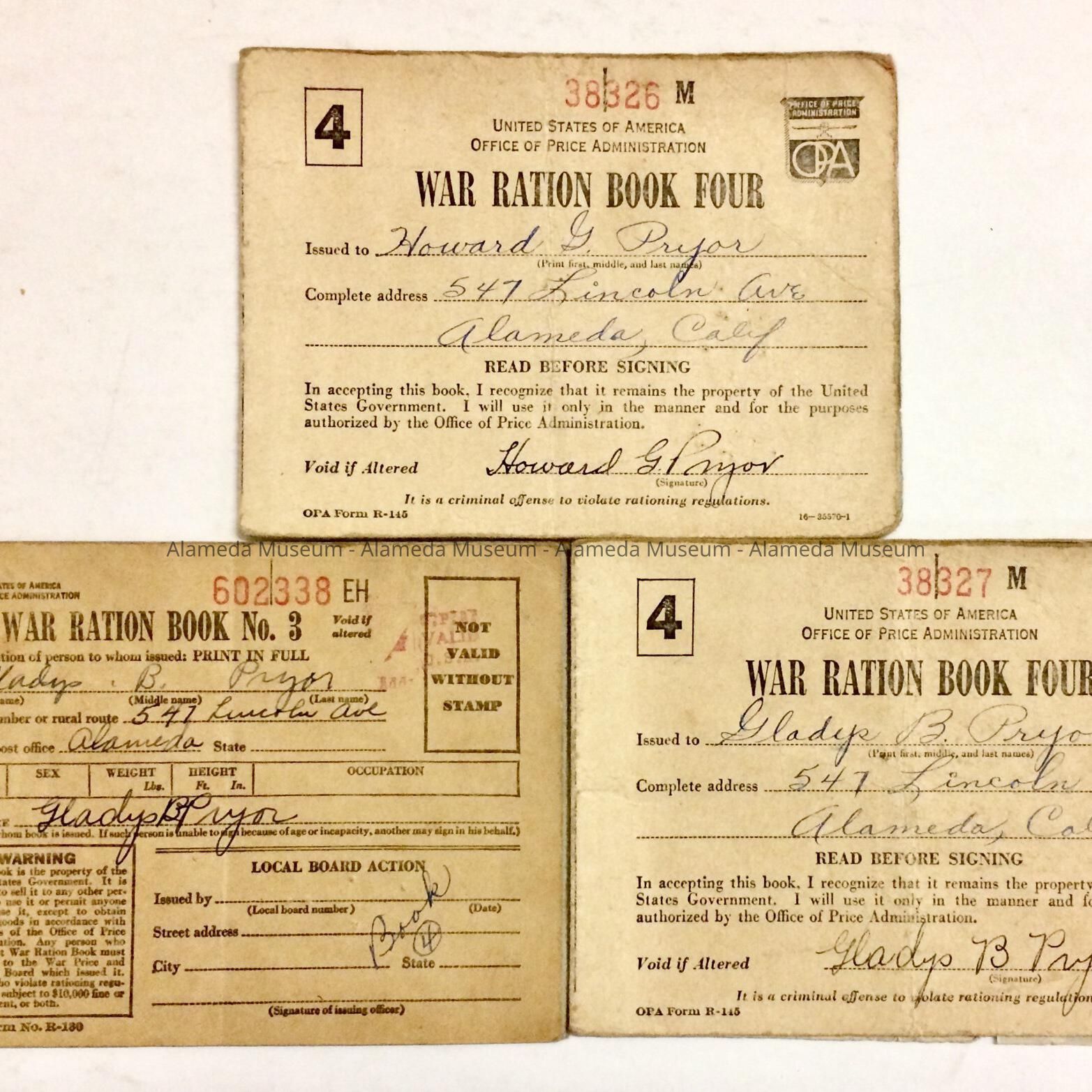 History of Objects: WWII Ration Stamp booklets issued to Howard G. and Gladys Pryor of 747 Lincoln Ave., Alameda. (See attached note on the back of this card that gives some history of the Pryor family in Alameda.)