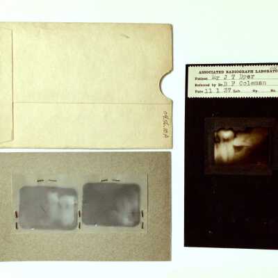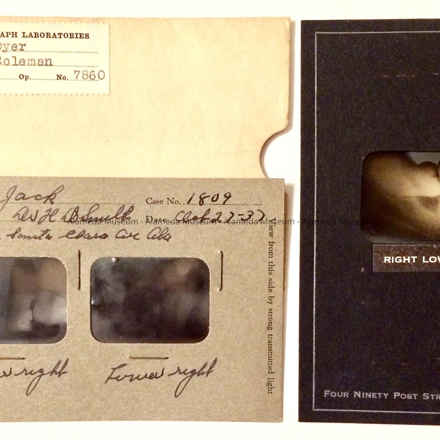 HISTORY OF OBJECTS: X RAY NEGATIVES TAKEN OF JACK DYER'S DENTAL AREA. DATED 1937. DR H D SMITH, 2242 SANTA CLARA AVENUE, ALAMEDA, WAS MR DYER'S DDS. DR SMITH WAS THE FIRST CURATOR OF THE ALAMEDA MUSEUM.