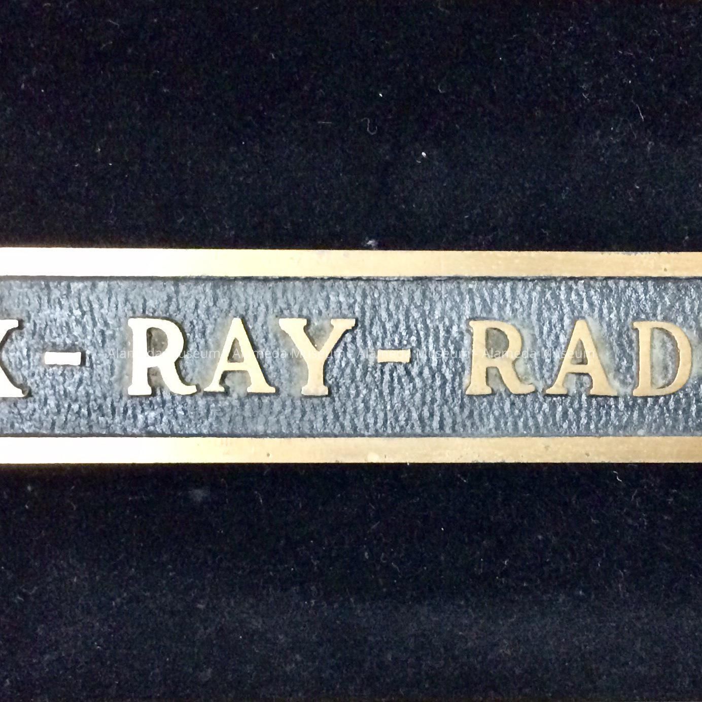 DESCRIPTION: A RECTANGULAR-SHAPED SIGN IN SOLID BRASS WITH RAISED LETTERING, "XRAY-RADIUM" ON A STIPPLED BACKGROUND WHICH HAS BEEN DARKENED TO DISPLAY THE CONTRAST BETWEEN THE MESSAGE AND THE BACKGROUND.