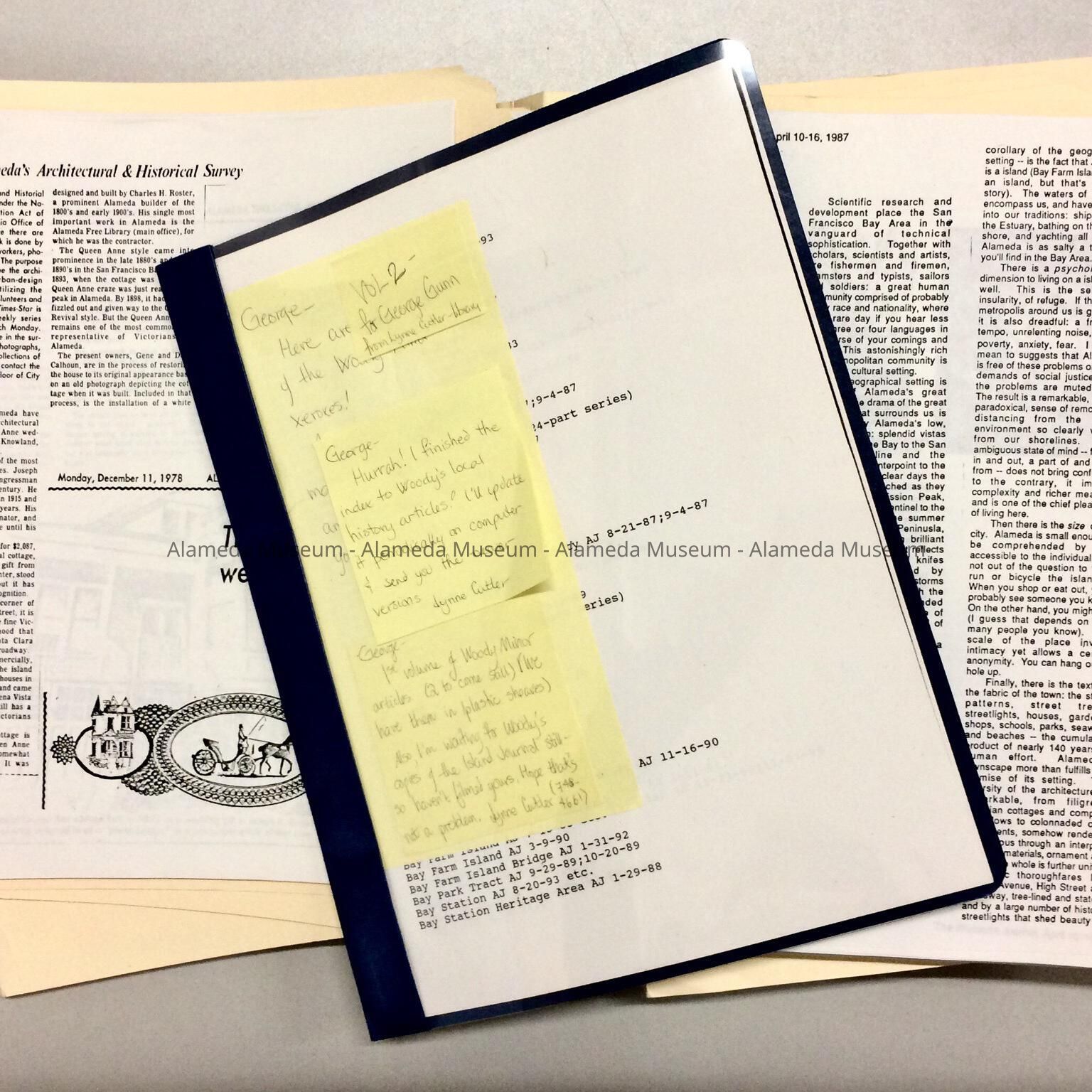The following are included: articles from the Time-Star, 1978-1979; Alameda Directory, 1989; Island Journal, 1982-1984; Alameda Journal 1987-January 1993; an article from the Alameda Journal, December 1993; and articles from the Alameda Journal, 1993-1994. The topics researched range from individual houses, to businesses, ferries, etc.
