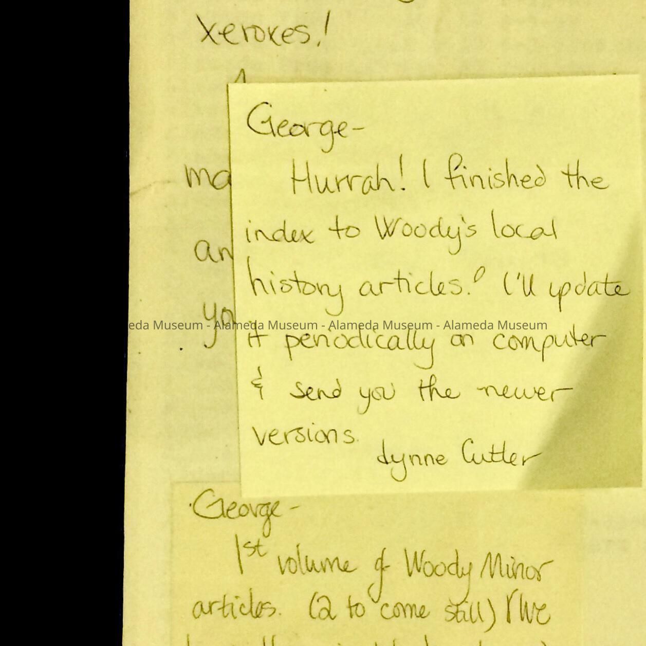 Copies of articles by Woodruff ('Woody') Minor as appeared in various newspapers during the period 1978-1994, eventually called the 'Heritage' column, and index thereto. From the post-it notes, it appears the papers were copied for Alameda Curator George Gunn, and the index was compiled by Alameda Reference Desk Librarian Lynne Cuttler, presumably around 1994. The index is alphabetical by subject.