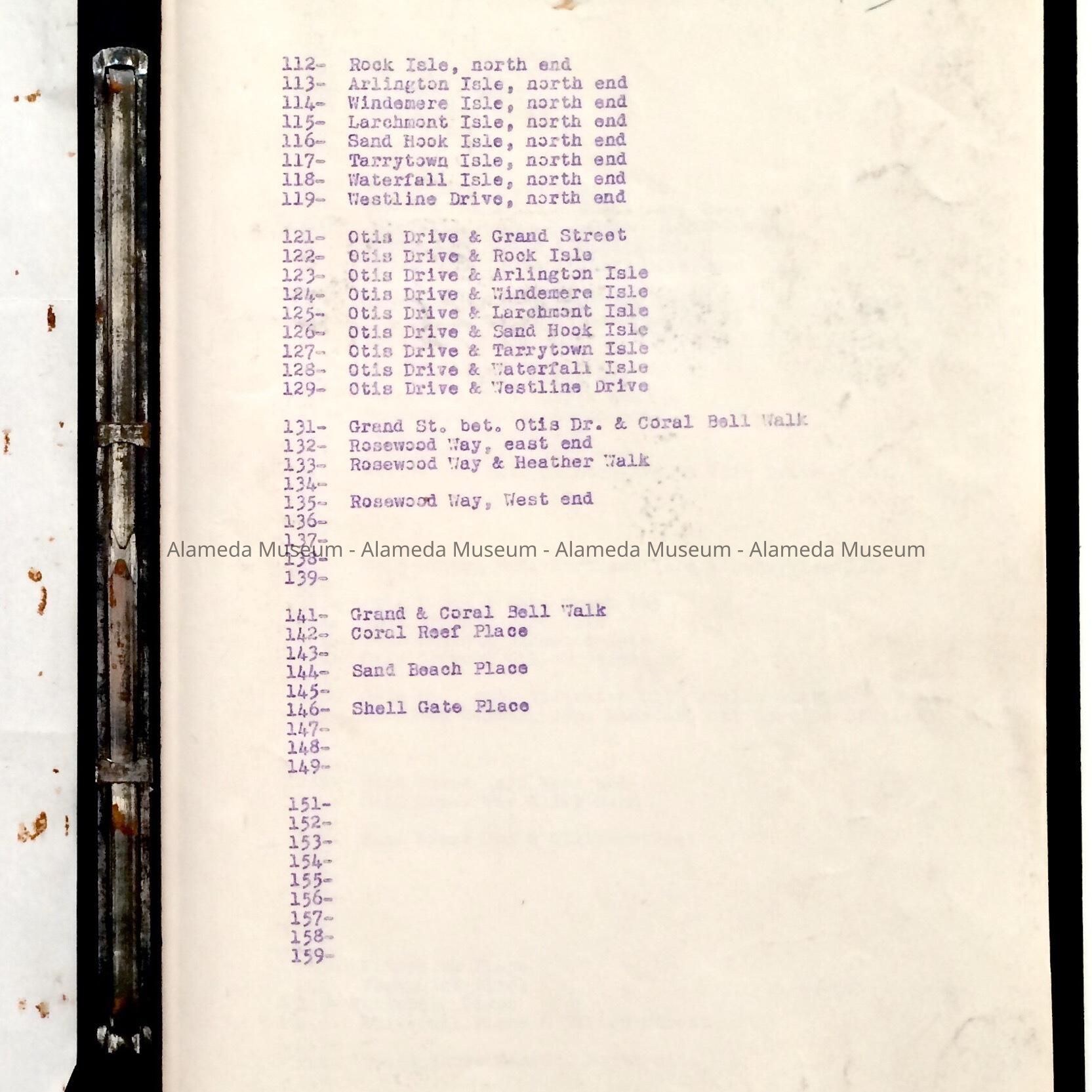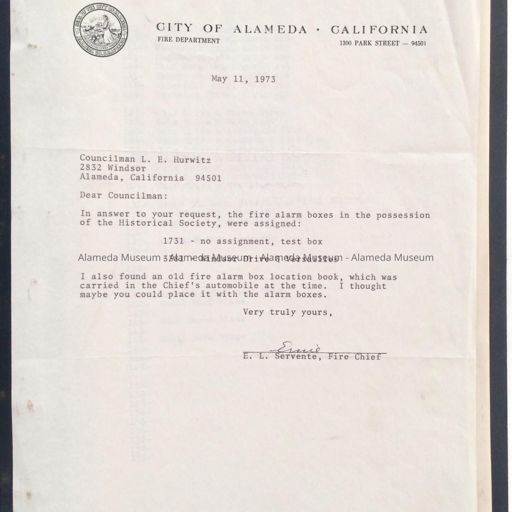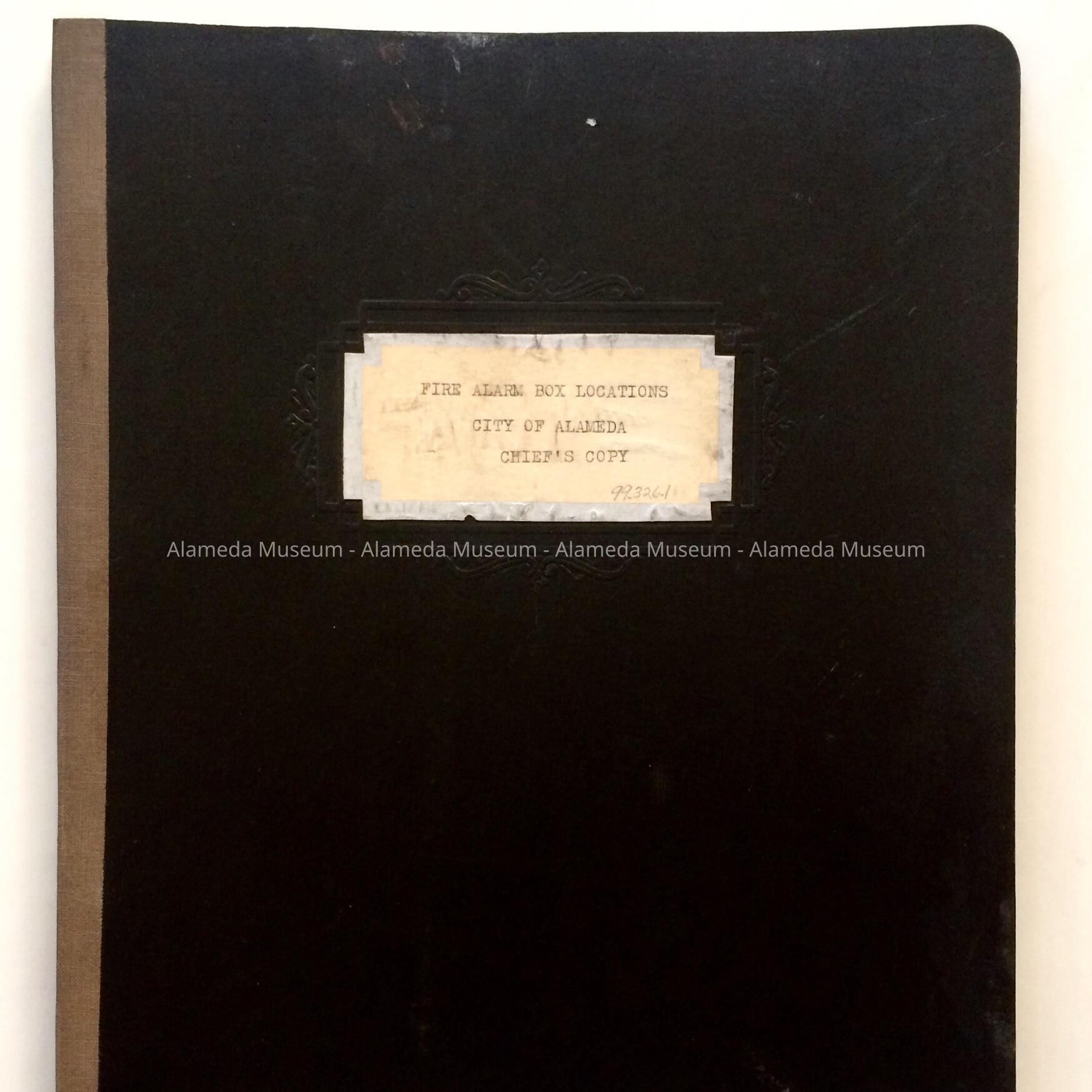 History: Inventory of Fire Alarm box locations, Chief's copy, City of Alameda. This publication was carried in the Chief's vehicle during the period. Publication also includes a letter from E.L. Servente, Fire Chief explaining the publication's significance.