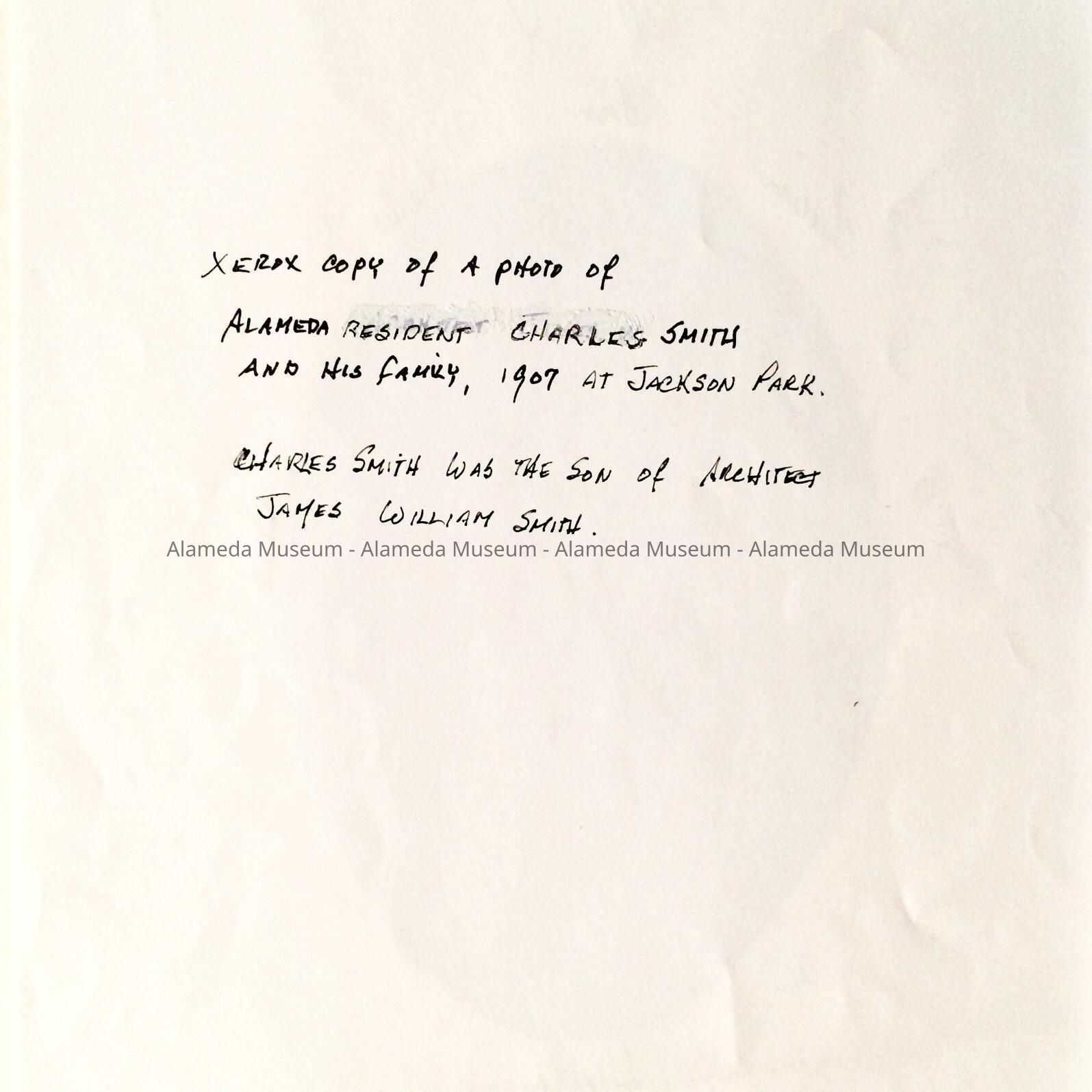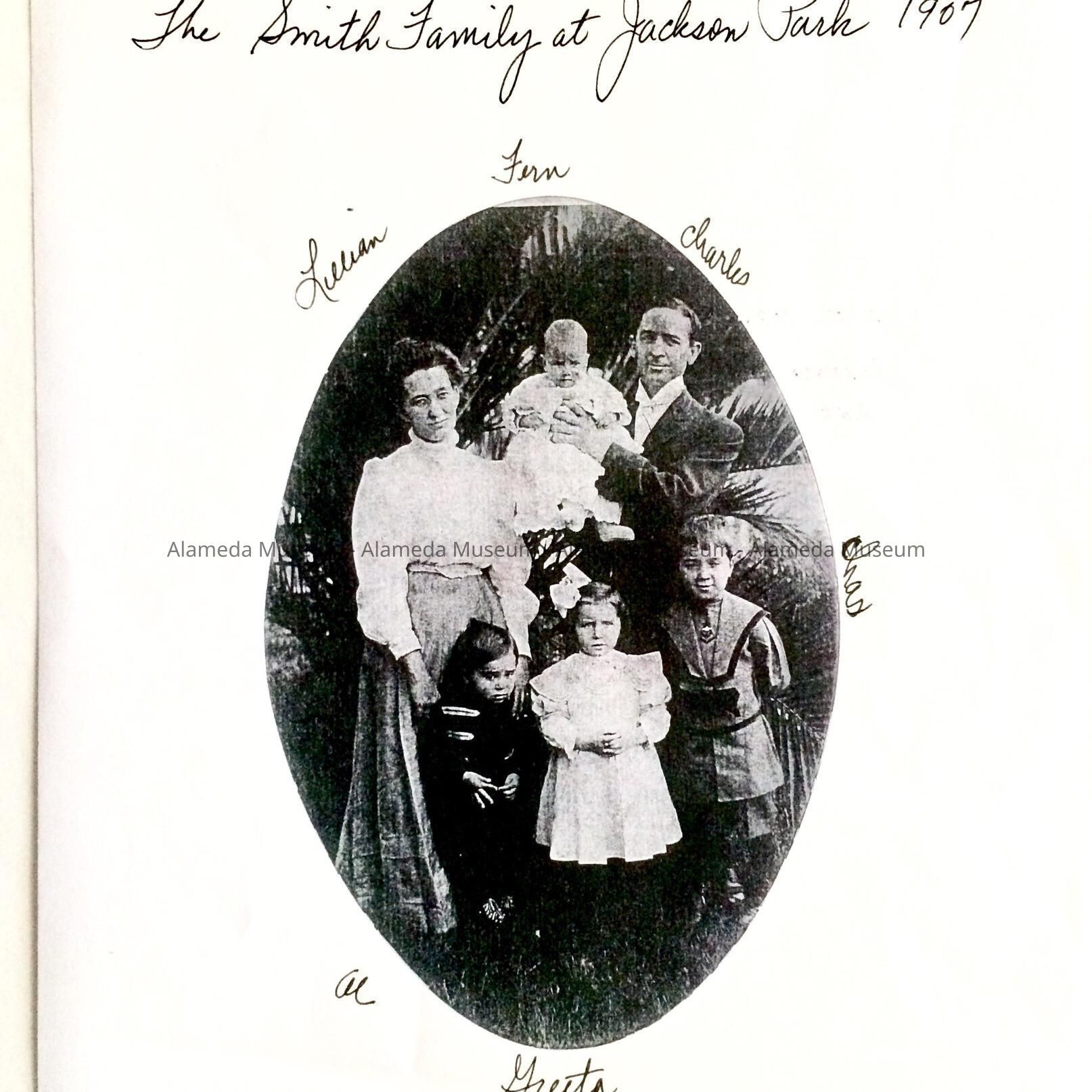 History of Object: Copy of an image showing the Charles Smith family at Jackson Park in 1907. The photo shows Charles, his wife Lillian, and their children Fern, Charles, Al and Greta. Charles' father was the architect James William Smith of Alameda.