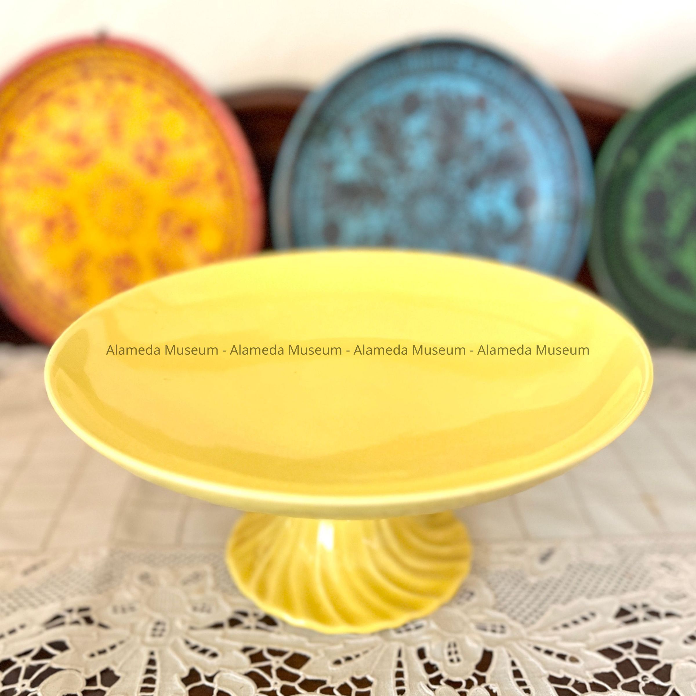 Description: A generic high glaze yellow colored circular shaped dish on a pedestal base, which has a fluted pattern.