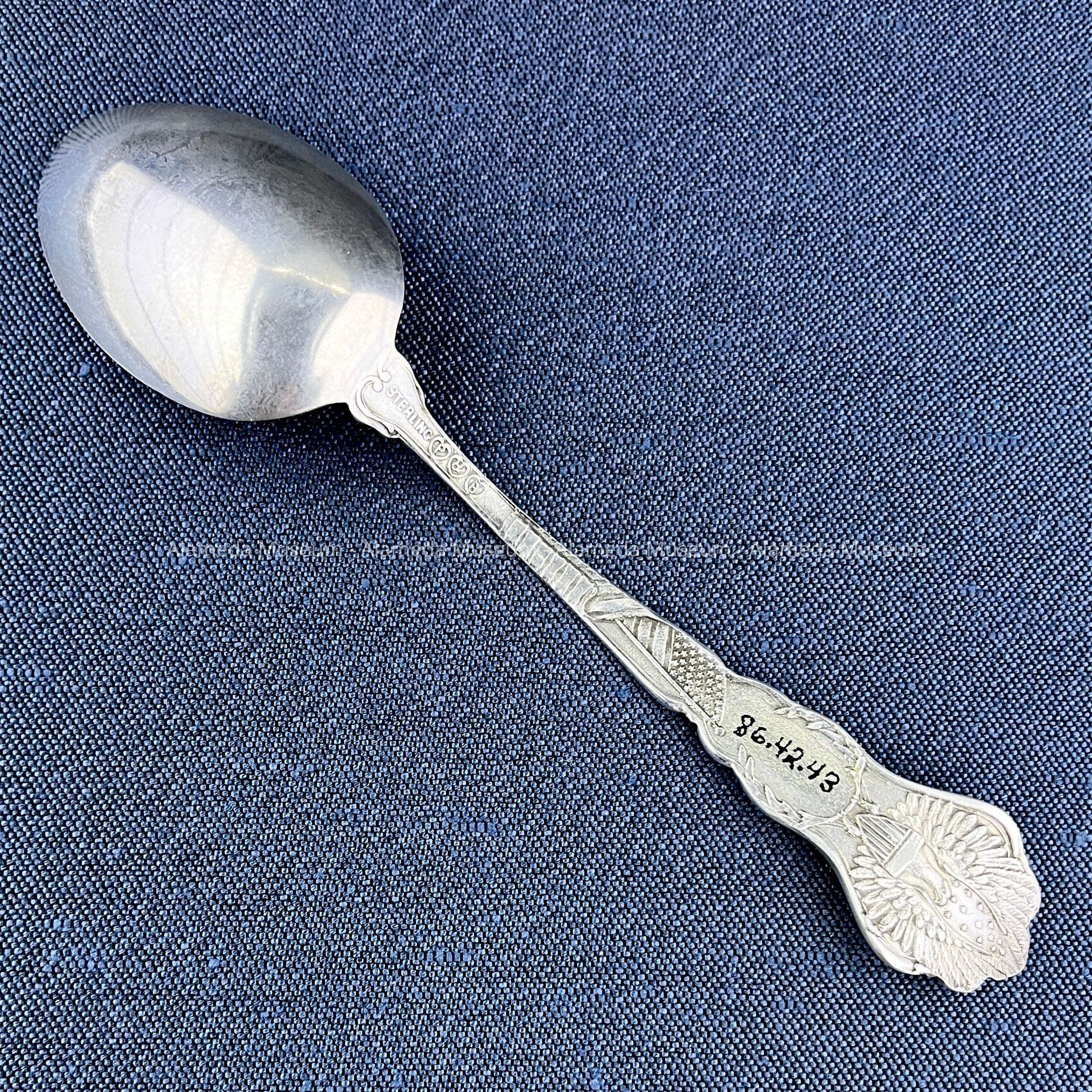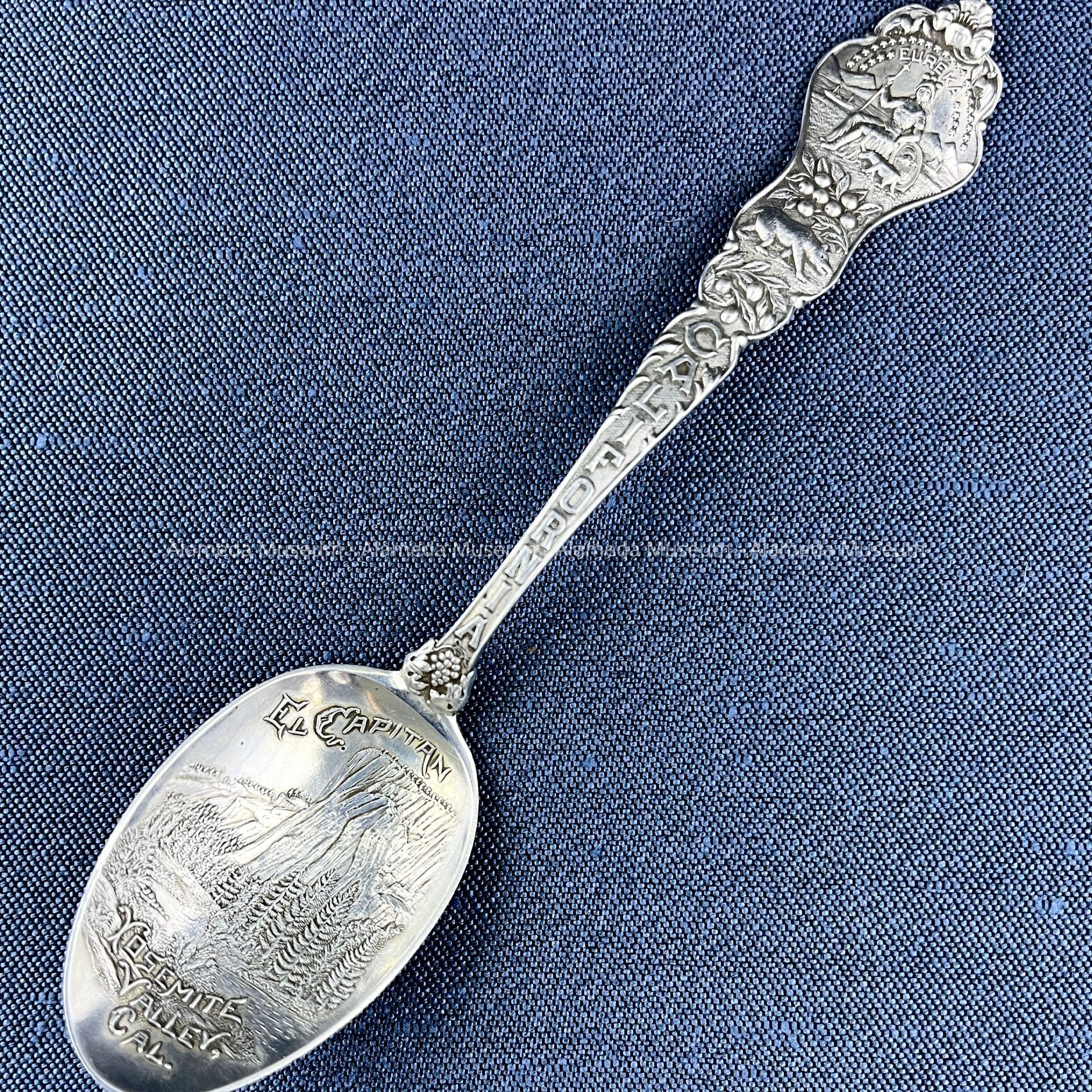 Description: Sterling silver teaspoon with scene in bowl (in relief) representing El Capitan, Yosemite Valley, Cal. Decorative medallion on handle contains the State Seal (Calif).