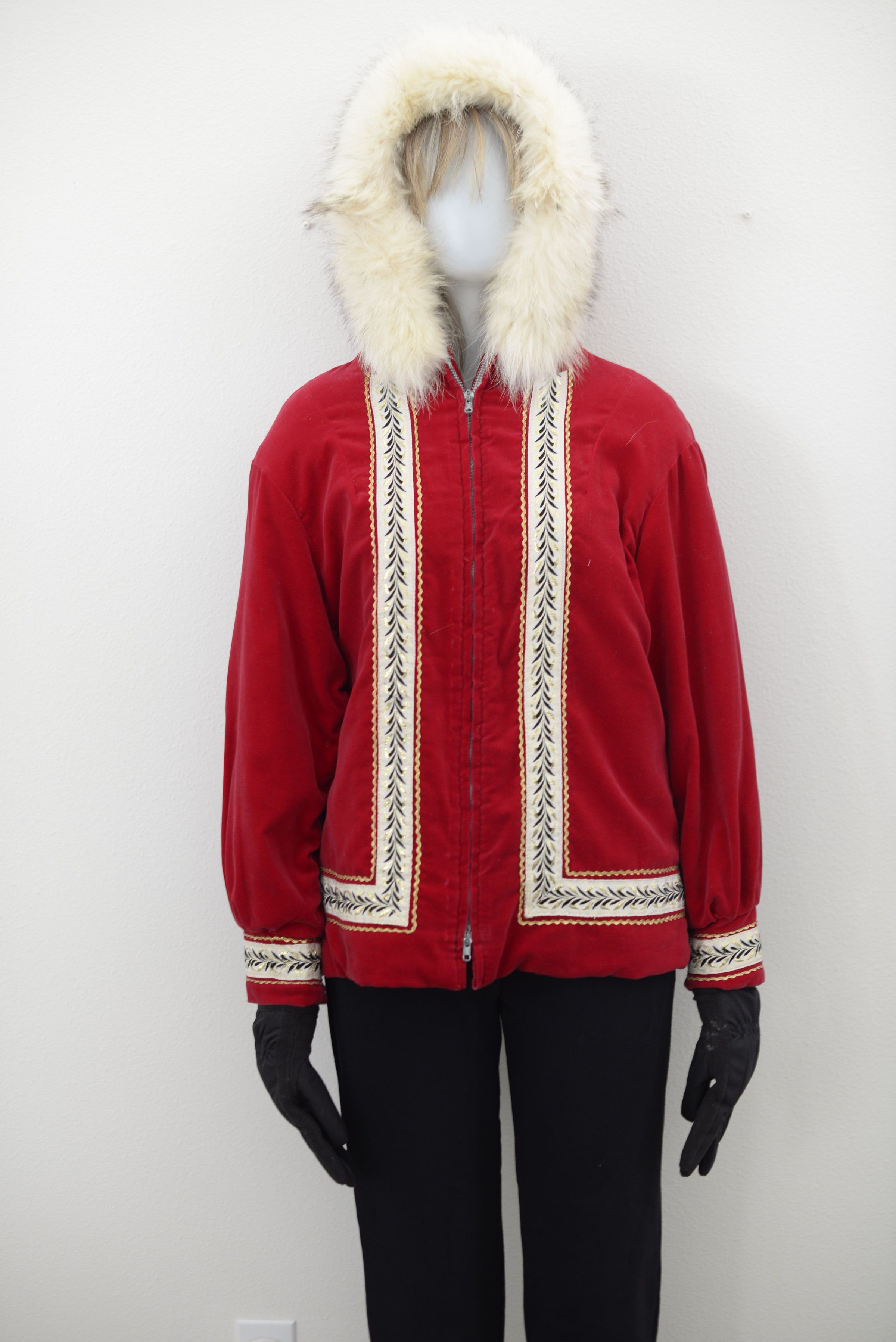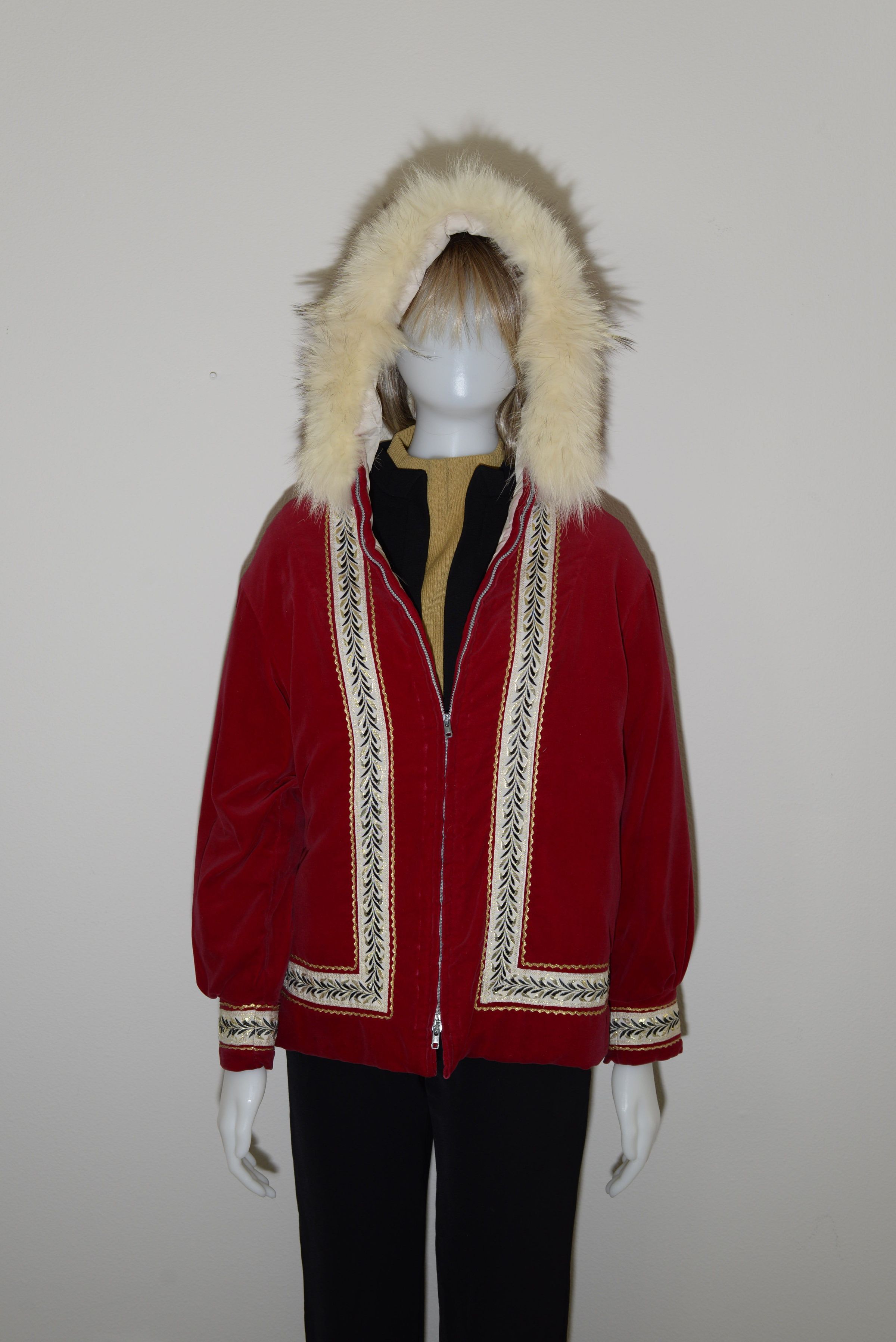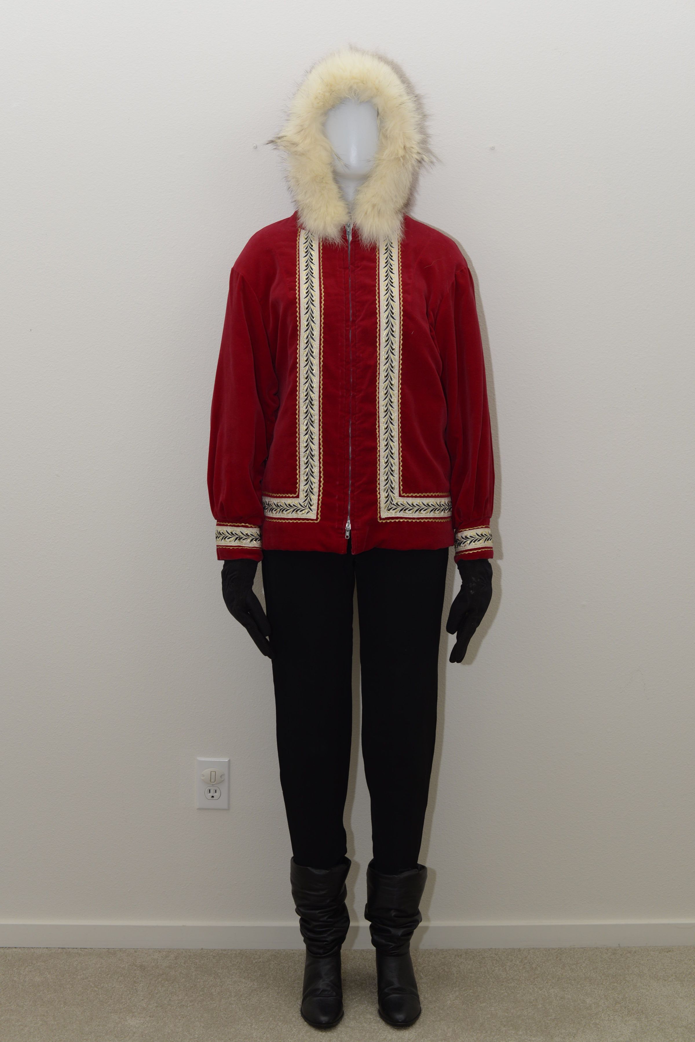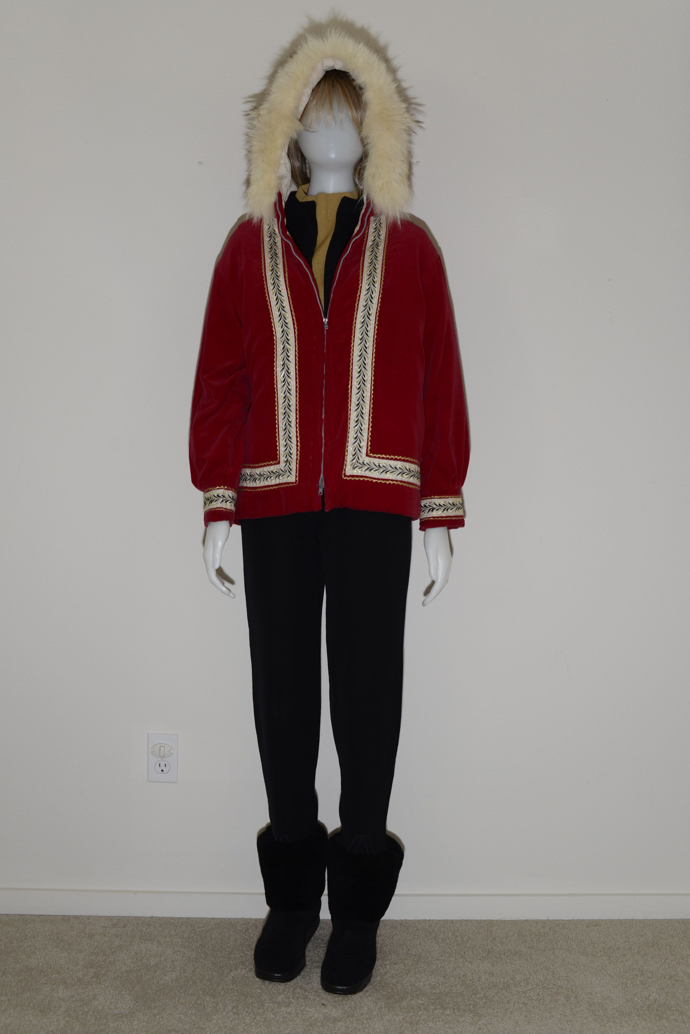 Red parka with wolverine fur, black stirrup pants, black short boots, black gloves. Also with black/gold sweater (2 options)Context